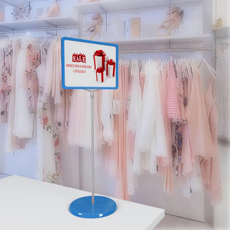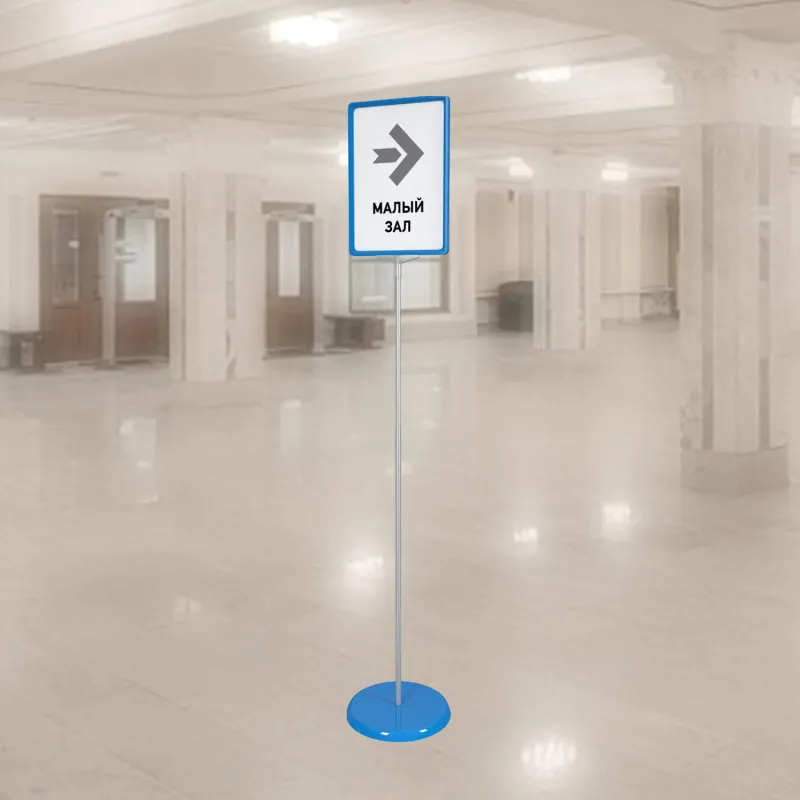 Напольный держатель для ценников и другой информации Attache имеет металлическую ножку высотой 100 см и горизонтально ориентированную пластиковую рамку формата А4. Материалы можно размещать с обеих сторон. Подходит для использования на торговых предприятиях, в выставочных залах. Рамку можно разместить вертикально. Подставка для рамки ценникодержателя в комплекте. Цвет - синий.