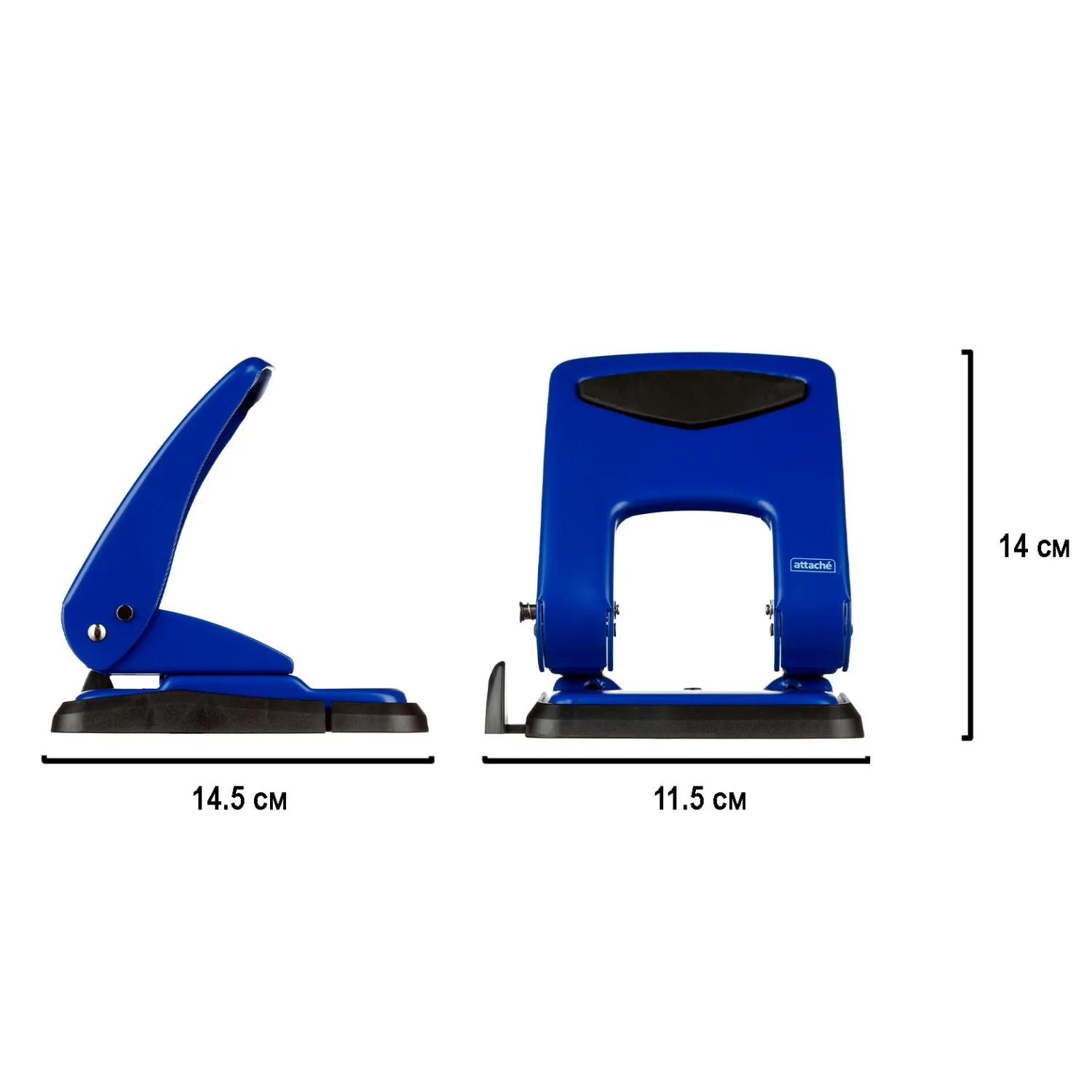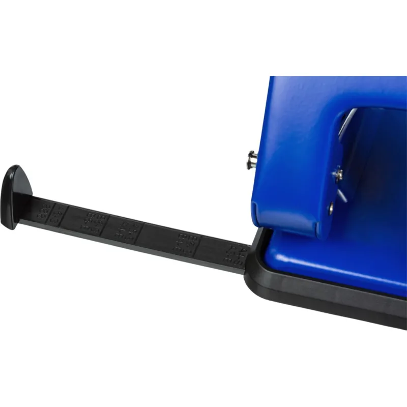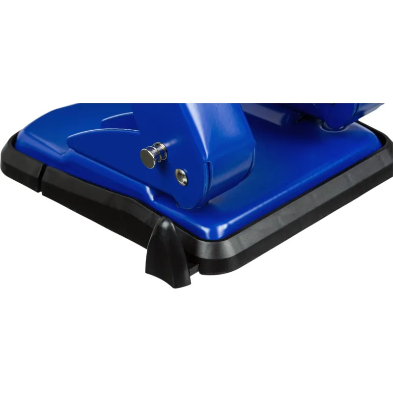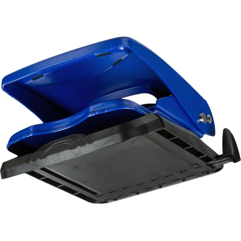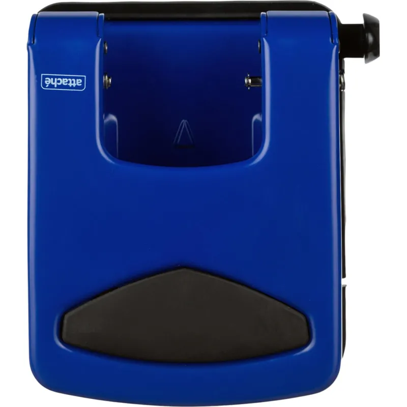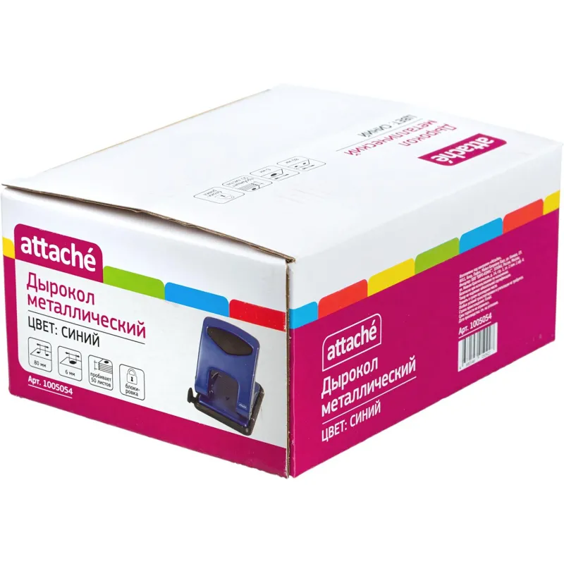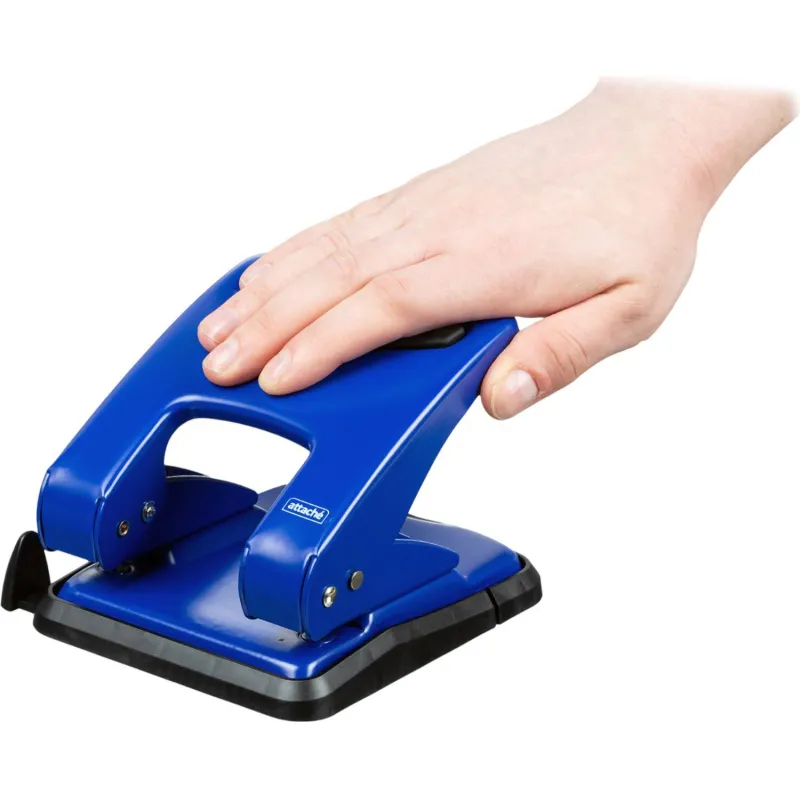 Дырокол Attache работает с документами толщиной до 50 листов плотностью 80 г/кв.м. Пробивает два отверстия диаметром 6 мм, расстояние между отверстиями — 80 мм. Размер дырокола: 13.3х14.7х14.5 см (со снятой блокировкой). Удобный контейнер легко открывается и закрывается, исключая рассыпание конфетти. Механизм металлический. Перед началом использования необходимо снять фиксацию дырокола в сложенном виде. Для этого нужно одновременно нажать на металлическую кнопку возле основания дырокола и верхнюю часть дырокола. Точно также можно зафиксировать дырокол обратно в закрытое положение для экономии рабочего пространства и удобной перевозки. Наличие линейки A3, A4, A5, A6, B4, B5, B6 позволяет зафиксировать бумагу на нужном расстоянии, отметка на линейке 888 позволяет использовать вместо дырокола на 4 отверстия. Дырокол выполнен в металлическом синем корпусе с противоскользящей прорезиненной вставкой черного цвета. Имеет метку центрирования.
