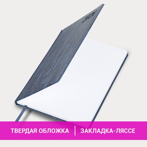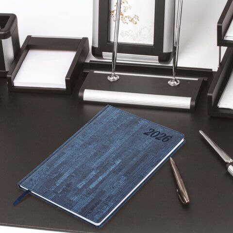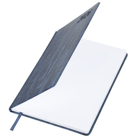Внутренний блок включает 64 листа белой бумаги плотностью 70 г/м2. Благодаря большому формату А4 еженедельник удобно использовать как в офисе, так и на выездных деловых встречах. Твердая обложка синего цвета, стилизованная под фактурную кожу благородного, подходит для горячего тиснения.