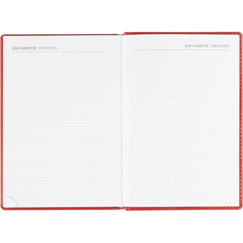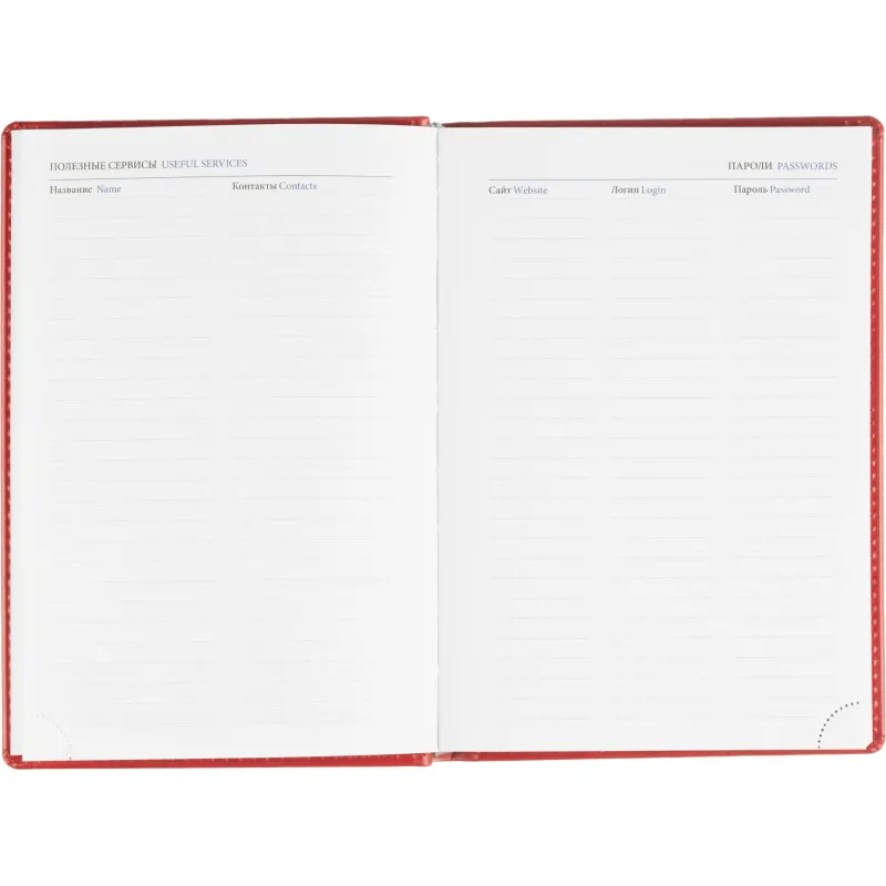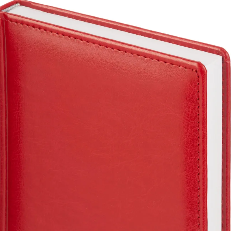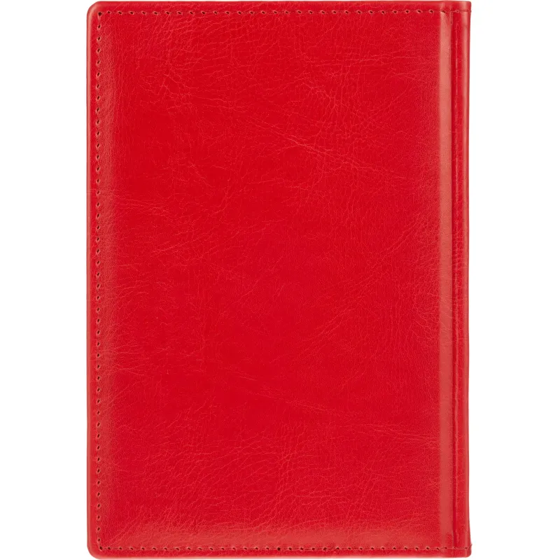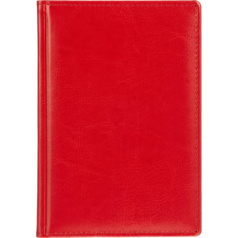 Данный ежедневник имеет формат A5, содержит 176 листов. Твёрдая обложка с поролоном, выполненная из высококачественной искуственной кожи красного цвета, придаёт изделию элегантный и профессиональный вид. Страницы выполнены из белой офсетной бумаги плотностью 70 г/кв.м. Дизайн обложки: универсальный.