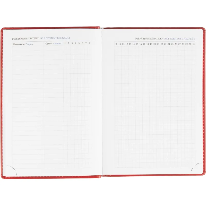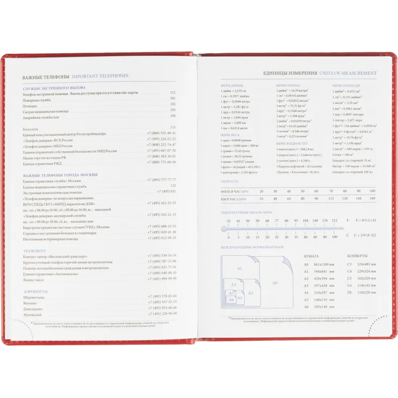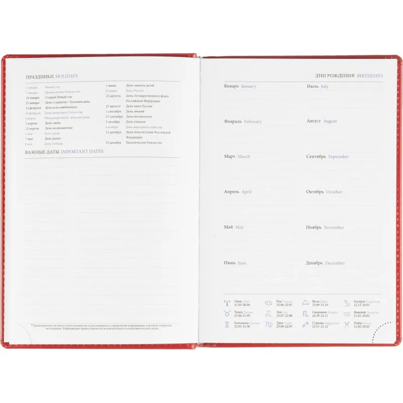 Ежедневник содержит информационно-справочный блок, включая личные данные, праздники, дни рождения и полезные сервисы. Блок также оснащён местами для записи регулярных платежей, важных телефонов и различных измерений. Перфорация уголка упрощает использование и добавляет удобства.
