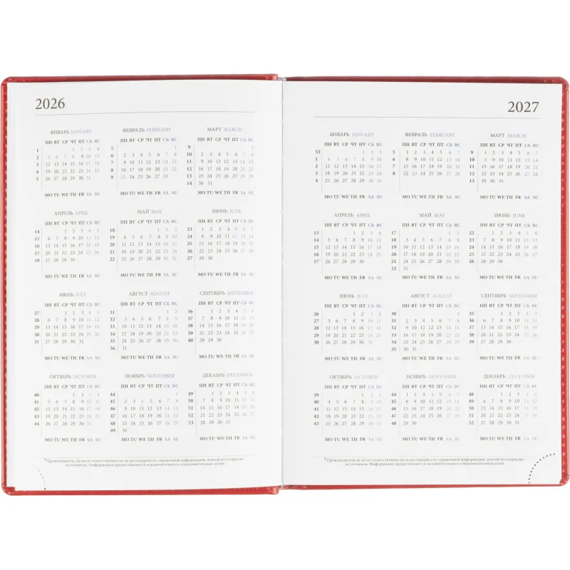 Среди дополнительных характеристик — ляссе серебристого цвета и уникальный блок, выполненный в двух цветах. На страницах предусмотрен календарь на 2026-2027 гг., что позволяет удобно планировать мероприятия и торжественные даты.