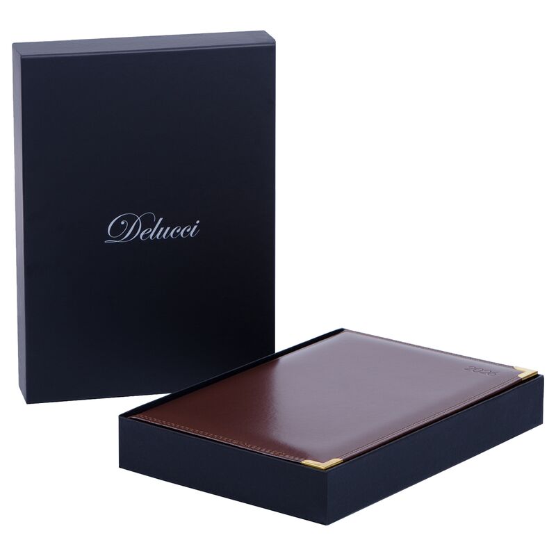 Изысканный датированный ежедневник Delucci формата B5 (175*250 мм) ? элегантный помощник для планирования. Обложка ежедневника с поролоновой прослойкой изготовлена из премиальной глянцевой экокожи, имитирующей кожу первоклассной выделки, и прошита двойной