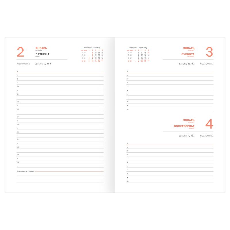 Датированный ежедневник на 2026 год BG серии "Ariane" формата А5 с обложкой из балакрона с поролоновой прослойкой идеален для ежедневного использования. Внутренний блок состоит из 176 листов белой офсетной бумаги плотностью 70 г/м2 с пантонной печатью в 2