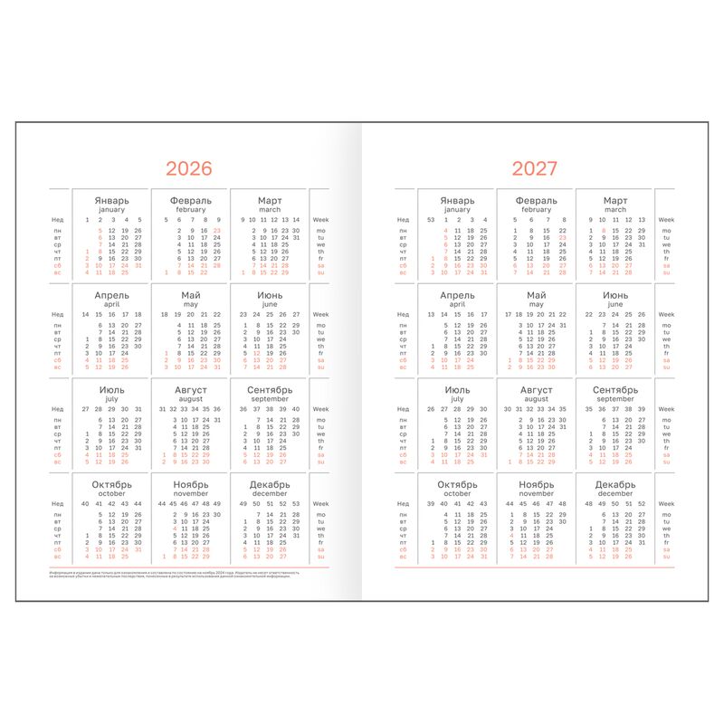 Датированный ежедневник на 2026 год BG серии "Ariane" формата А6 с обложкой из балакрона с поролоновой прослойкой идеален для ежедневного использования. Внутренний блок состоит из 176 листов белой офсетной бумаги плотностью 70 г/м2 с пантонной печатью в 2