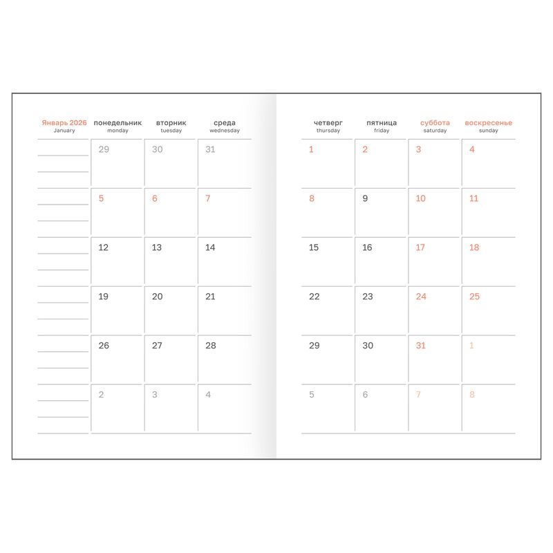 Датированный ежедневник на 2026 год BG серии "Ariane" формата А6 с обложкой из балакрона с поролоновой прослойкой идеален для ежедневного использования. Внутренний блок состоит из 176 листов белой офсетной бумаги плотностью 70 г/м2 с пантонной печатью в 2