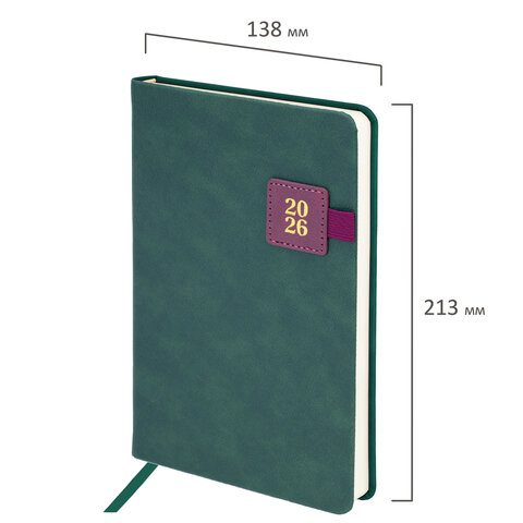 Ежедневник датированный 2026 А5 138х213 мм, BRAUBERG "Accent", под кожу, держатель, зеленый/бордо, 170208