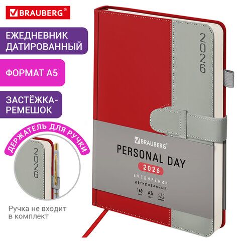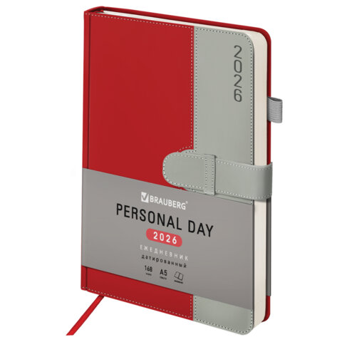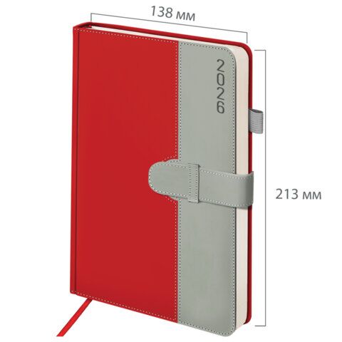 Ежедневник датированный 2026, А5, 138х213 мм, BRAUBERG "Esthetic", под кожу, держатель для ручки, застежка, красный/серый, 170192, купить в Грант СПБ
