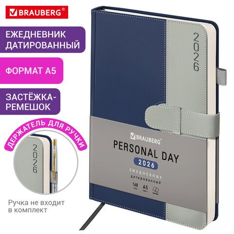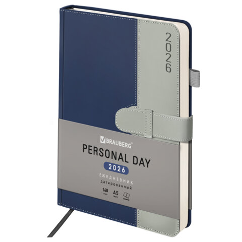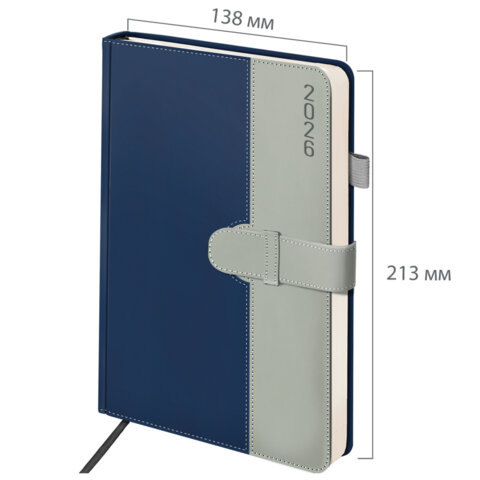 Ежедневник датированный 2026, А5, 138х213 мм, BRAUBERG "Esthetic", под кожу, держатель для ручки, застежка, синий/серый, 170194, купить в Грант СПБ