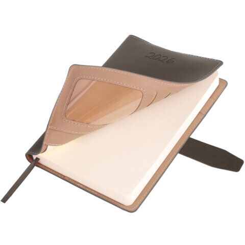 Ежедневник датированный 2026, А5, 143х218 мм, BRAUBERG "Journal", под кожу, застежка, держатель для ручки, органайзер, серый, 170202
