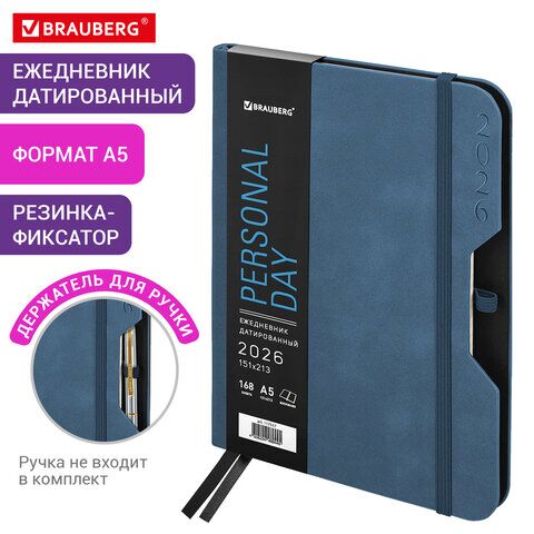 Ежедневник датированный 2026, А5, 151х213 мм, BRAUBERG "Note", под кожу, держатель для ручки, синий, 170327, купить в Грант СПБ