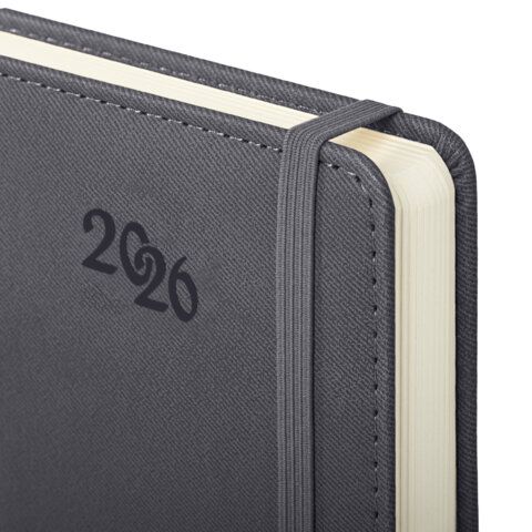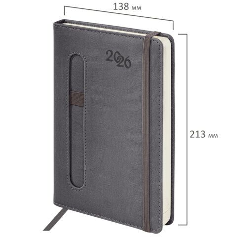 Ежедневник датированный 2026, А5, 138x213 мм, BRAUBERG "Optimal", под кожу, резинка, держатель для ручки, серый, 170280