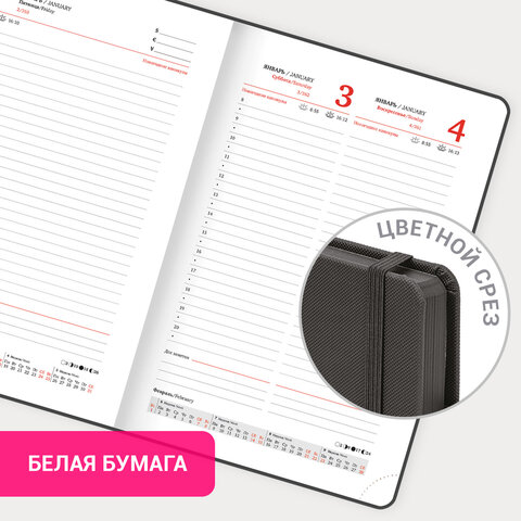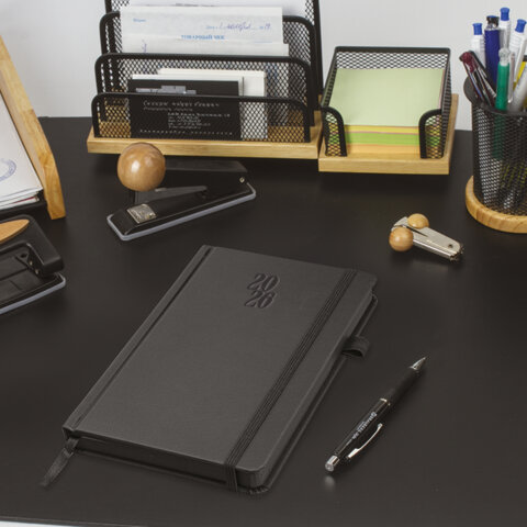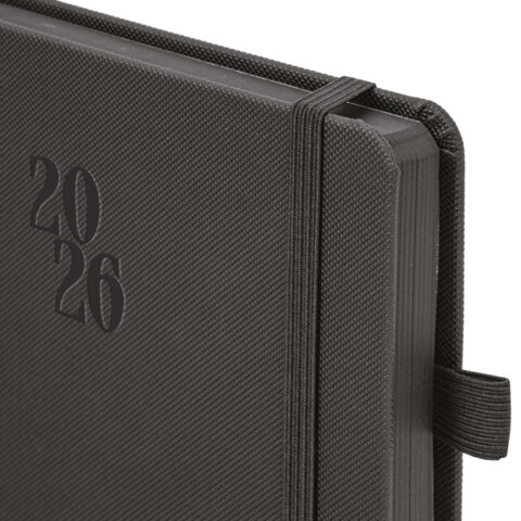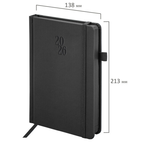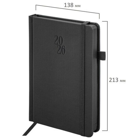 Ежедневник датированный 2026, А5, 138х213 мм, BRAUBERG "Plain", под кожу, резинка, держатель для ручки, черный, 170315, купить в Грант СПБ