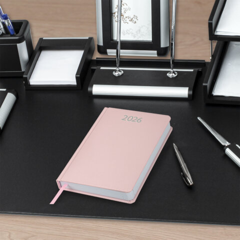 Обложка датированного ежедневника BRAUBERG "Profile" выполнена из приятного на ощупь рельефного материала, имитирующего фактурную кожу, и выдержана в нежном светло-розовом цвете. Модель подойдёт тем, кто предпочитает сдержанный стиль и деловой формат. Вну
