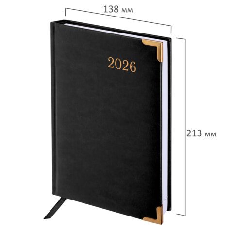 Ежедневник датированный 2026, А5, 138x213 мм, BRAUBERG "Senator", под кожу, черный, 169945