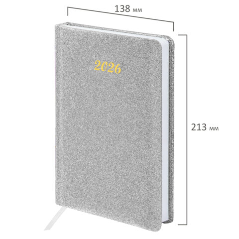 Ежедневник датированный 2026, А5, 138x213 мм, BRAUBERG "Sparkle", под кожу, блестки, серебристый, 170251