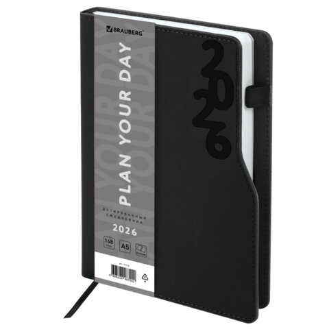 Ежедневник датированный 2026, А5, 150x213 мм, BRAUBERG "Up", под кожу, софт-тач, держатель для ручки, черный, 169967, купить в Грант СПБ