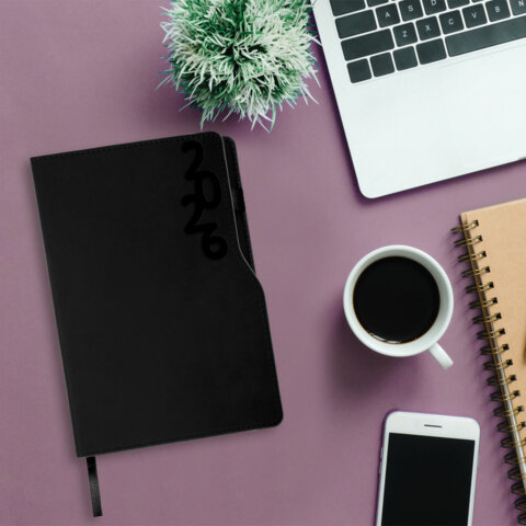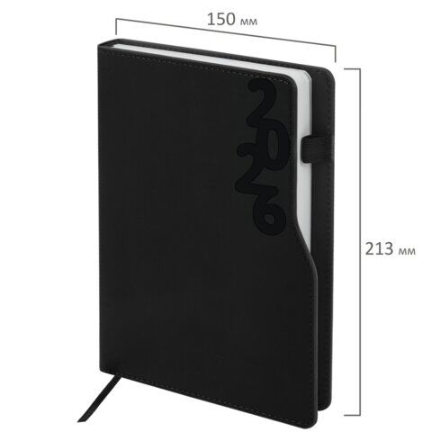 Ежедневник датированный 2026, А5, 150x213 мм, BRAUBERG "Up", под кожу, софт-тач, держатель для ручки, черный, 169967