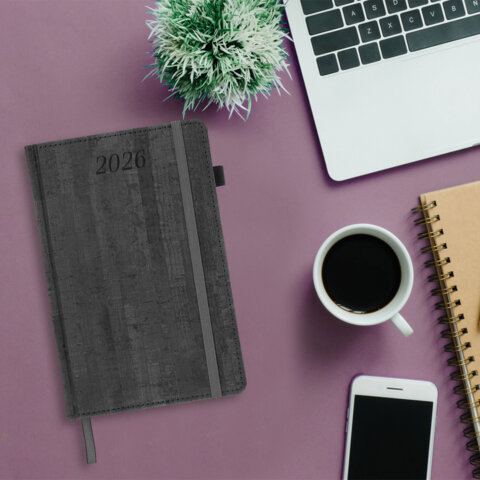 Ежедневник датированный 2026 А5 138x213 мм, BRAUBERG "Wood", под кожу, держатель для ручки, серый, 169959