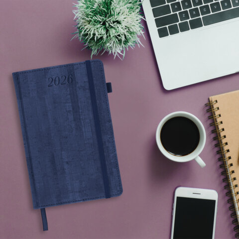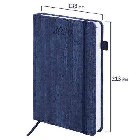 Ежедневник датированный 2026 А5 138x213 мм, BRAUBERG "Wood", под кожу, держатель для ручки, синий, 169957