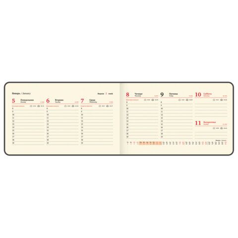 Датированный еженедельник BRAUBERG "Imprint" выполнен в оригинальном дизайне. Гибкая обложка украшена дизайнерским тиснением. Имеет книжную ориентацию. Внутренний блок включает 64 листа тонированной бумаги плотностью 70 г/м2. Благодаря малому формату А6 (