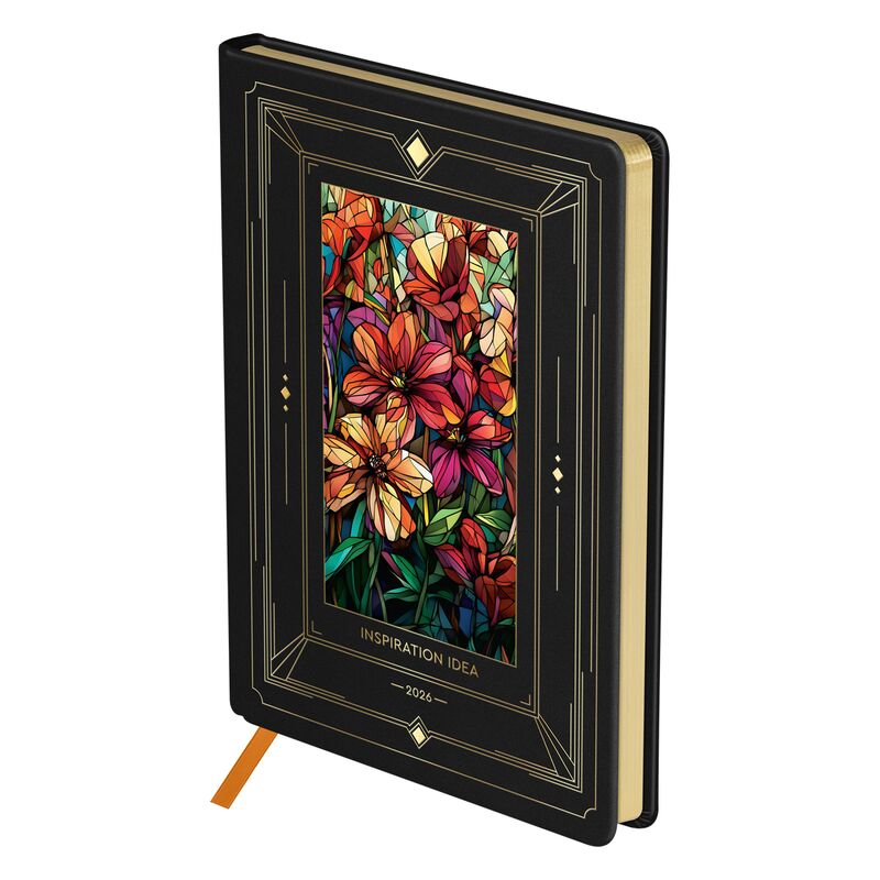 Прикоснитесь к изысканности с новыми ежедневниками Grenwich Line, облаченными в роскошную черную кожаную обложку. Сквозь прямоугольное окно словно пробивается свет, создавая эффект настоящего витража. Яркие цветы каждое утро напомнят о красоте жизни, вдох