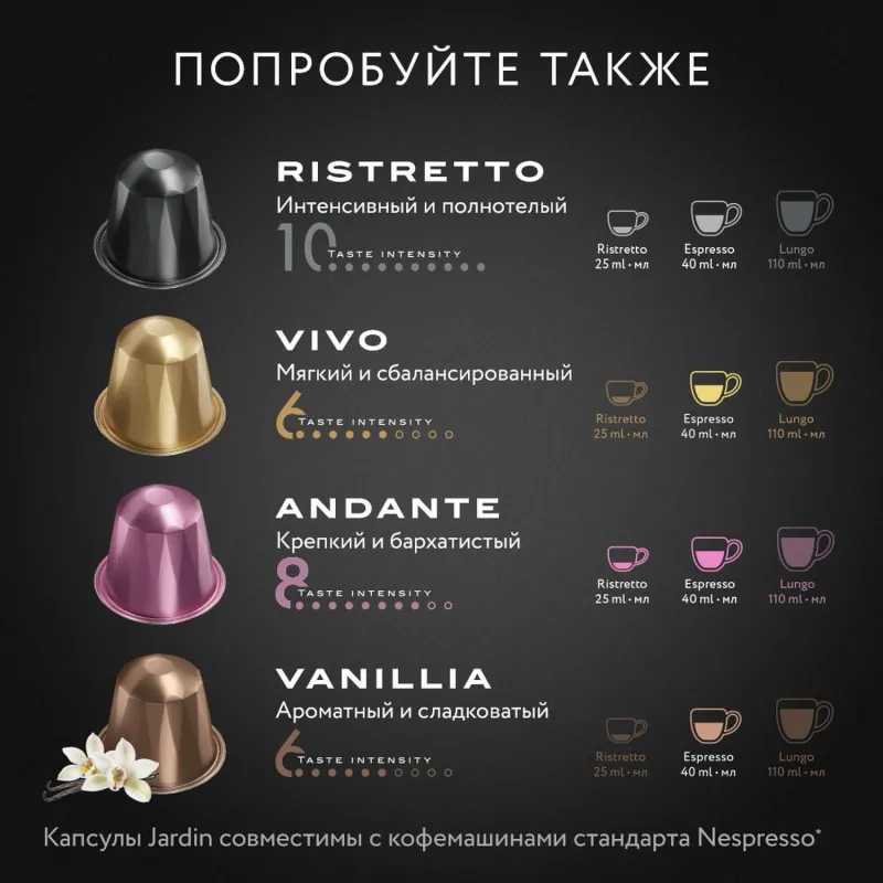 Капсулы для кофемашин Nespresso Jardin Allonge - это бережно обжаренный бленд восточноафриканской арабики. Идеально сбалансированный лунго с нежным вкусом, оставляющий легкие фруктовые ноты в долгом и сладком послевкусии. Состав: кофе жареный молотый. Степень обжарки: средняя. Вид кофе: кофе в капсулах. Способ приготовления: для заваривания в капсульной кофемашине стандарта Nespresso, кроме машин серии U (U Pure, Umilk) . Вес: 55 г (10 капсул). Тип упаковки: картонная коробка. Условия хранения: хранить в защищенном от прямых солнечных лучей месте при температуре не выше 30°. Страна производства: Россия.