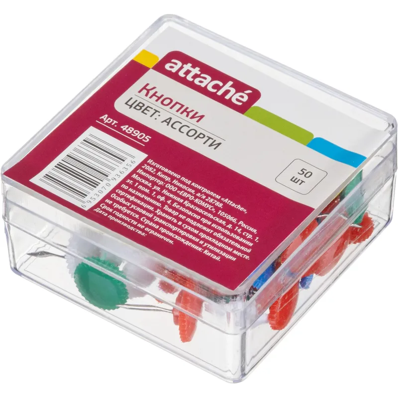Кнопки канцелярские Attache с пластиковой шляпкой диаметром 12 мм и металлической игольчатой ножкой. Длина иглы 10 мм. В пластиковой упаковке 50 разноцветных кнопок. В коробке 12 упаковок.
