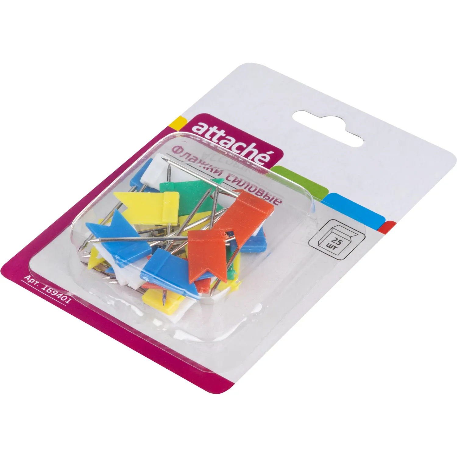 Кнопки-флажки силовые Attache предназначены для крепления информации на текстильных и пробковых досках. Шляпки кнопок в форме флажка выполнены из пластика, а основания в виде иголок - из прочного металла. В упаковке содержится 25 кнопок с разноцветными шляпками. Кнопки флага: красные, синие, зеленые, желтые, белые (по каждом цвету 5 штук). Длина кнопки с флажком - 33.5 мм, длина иглы без флажка - 23.5 мм.
