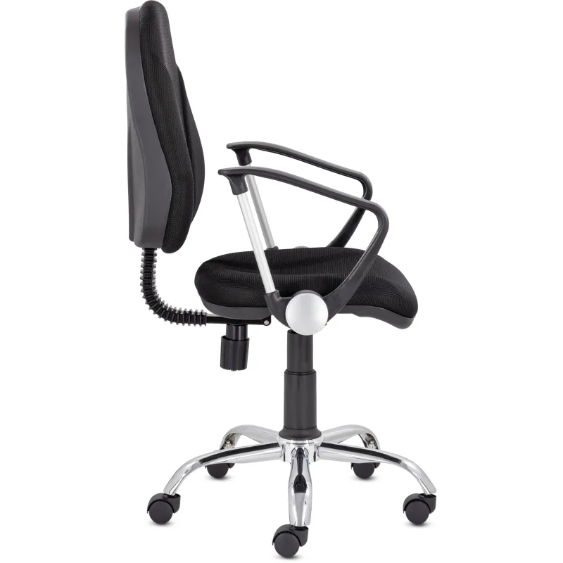 Офисное кресло Клио с обивкой из черной синтетической ткани TW. Подлокотники пластиковые с хромированными металлическими вставками. Крестовина из хромированного металла. Кресло оборудовано пружинным механизмом поддержки спины с возможностью регулировки сиденья по высоте. Максимальная статическая нагрузка на кресло - 100 кг.Изображения товаров на сайте не могут гарантировать точную цветопередачу.