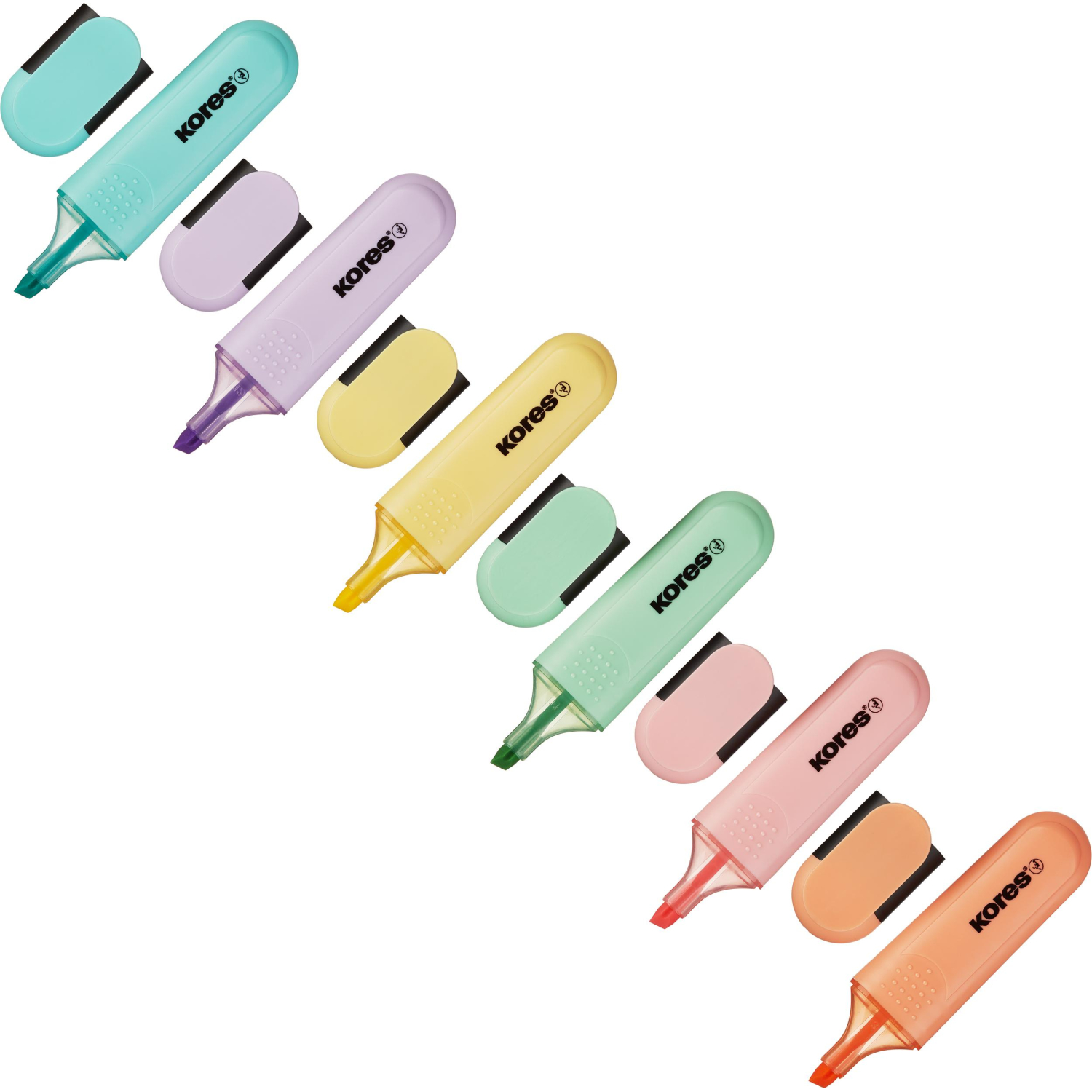 Текстовыделители Kores Bright Liner Plus со скошенным наконечником. Маркеры пастельных цветов: желтый, голубой, зеленый, розовый, оранжевый, фиолетовый. Чернила на водной основе. Предназначены для выделения текста на различных типах бумаги. Позволяют проводить линии толщиной 0,5-5 мм. Удобный пластиковый корпус. Безопасно при использовании по назначению. Хранить в сухом месте при температуре от 5 до 35 °C.