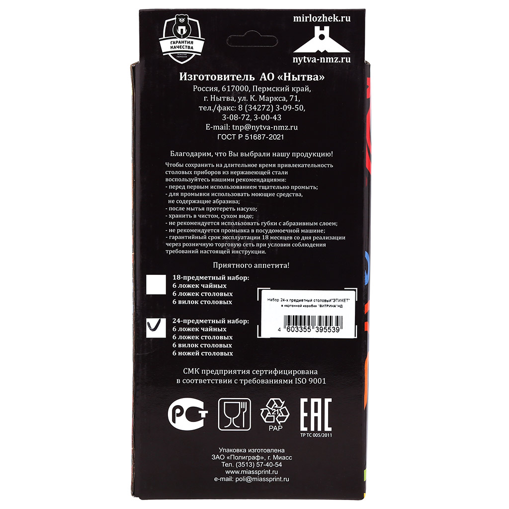 Набор столовых приборов "Этикет" 24 предметов: вилка столовая - 6шт, ложка столовая - 6шт, нож столовый - 6шт, ложка чайная - 6шт, нержавеющая сталь 18/10, 18/0, ГОСТ Р 51687-2000, 2,5мм, картонная коробка "витрина" (Россия), 172000,  купить в Грант СПБ