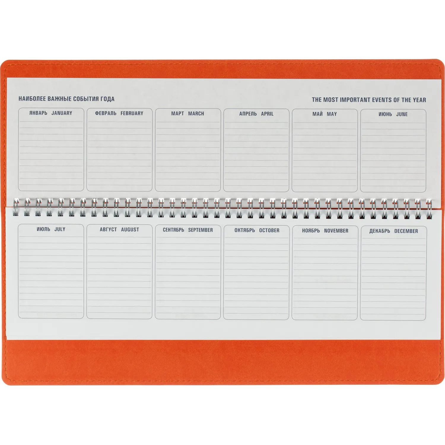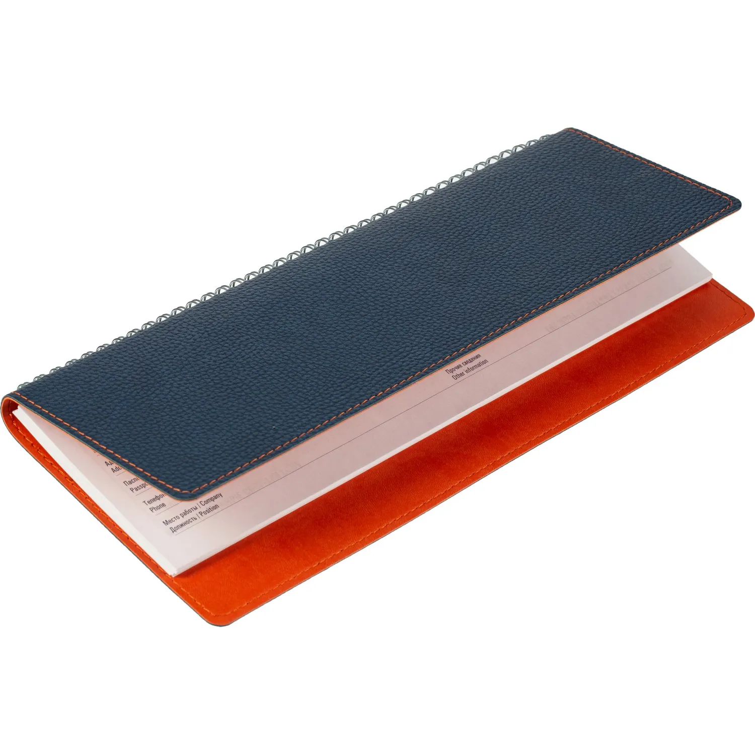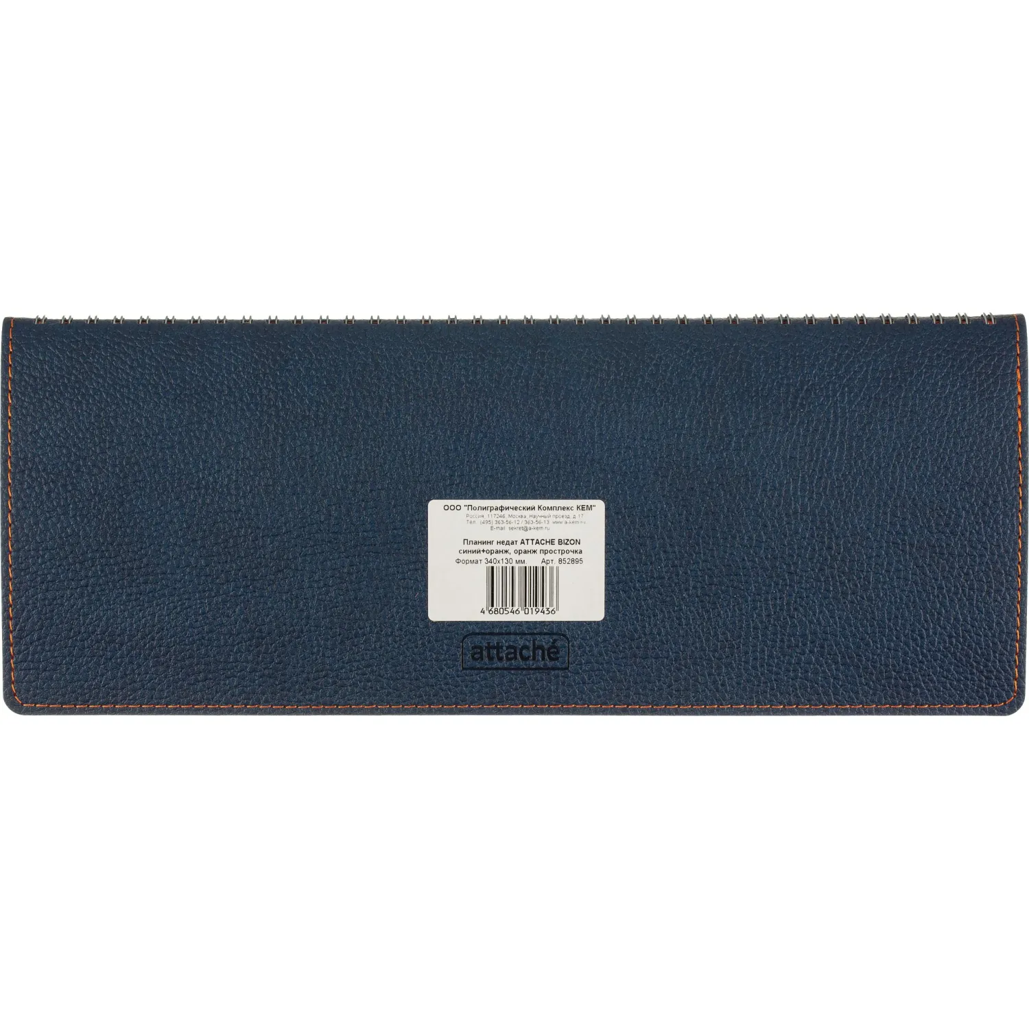 Планинг недатированный Attache Bizon. Размер 340x130 мм. Планинг со строгим дизайном, на скрытой пружине. Обложка: мягкая из искусственной кожи синего цвета с декоративной оранжевой прострочкой по периметру. Углы обложки скруглены. Блок: недатированный, 57 листов (114 страниц), печать в 2+2 краски, цвет бумаги - 100% белизны, 70 г/кв.м. (линейка). Информационный блок содержит: личные данные, планирование, наиболее важные события года, блок для заметок.