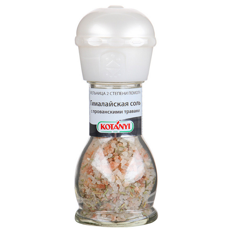 Гималайская соль добывается на севере Пакистана и известна своим высочайшим качеством. Ее оранжевый цвет объясняется высоким содержанием железа. Гималайская соль в сочетании с ароматными травами подходит для мясных, рыбных, овощных блюд, а также для соусов и салатов. Конструкция мельнички позволяет осуществлять 2 степени помола (крупный и мелкий).Состав: (95%) гималайская соль, розмарин, тимьян, чабер садовый, базилик, эстрагон. Пищевая ценность в 100г продукта: углеводы - 2,3г. Энергетическая ценность 17 ккал. Хранить плотно закрытым в сухом месте.