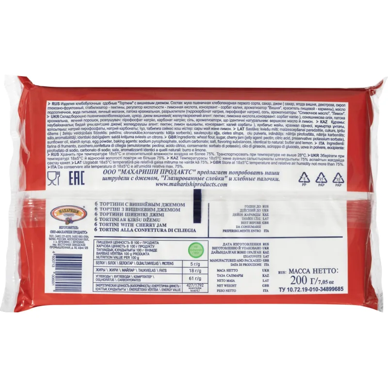 Кексы Тортини с вишневым джемом. Масса нетто: 200 г Состав: мука пшеничная хлебопекарная в/с, сахар, джем ( сахар, ягода вишня, декстроза, сироп глюкозно-фруктозный, стабилизатор- пектин, регулятор кислотности- лимонная кислота, консервант- сорбат калия, ароматизатор Вишня, краситель пищевой- кармин), масла растительные, вода питьевая, яичный меланж, патока, разрыхлитель (натрий двууглекислый, пирофосфат натрия), соль, ароматизаторы: Сливочное масло, лимон. Пищевая ценность на 100 г продукта: белки: 5.6 г жиры: 13 г углеводы: 60.5 г Энергетическая ценность на 100 г продукта: 381 ккал. Условия хранения: хранить при температуре от 18+5 градусов Цельсия и относительной влажности воздуха 75%. Страна производства: Россия