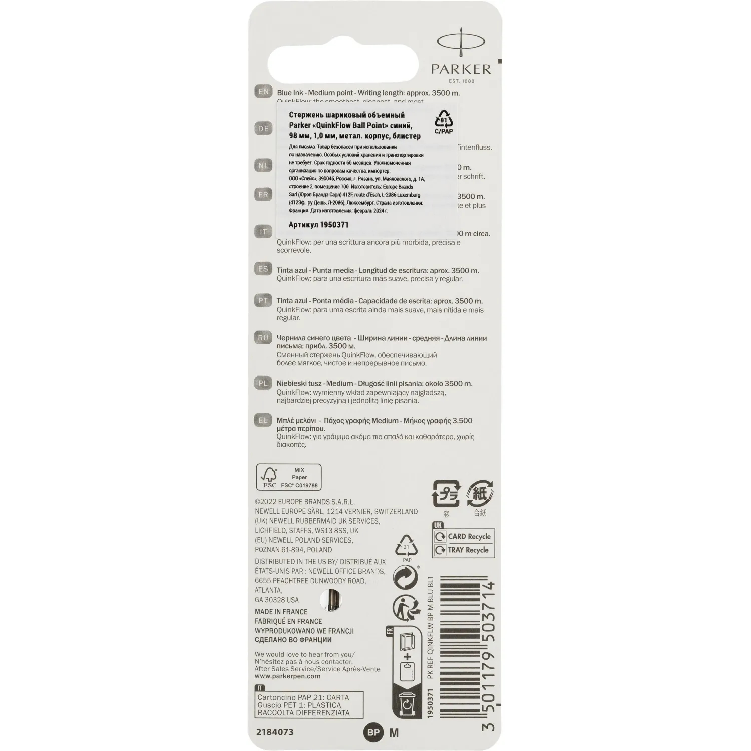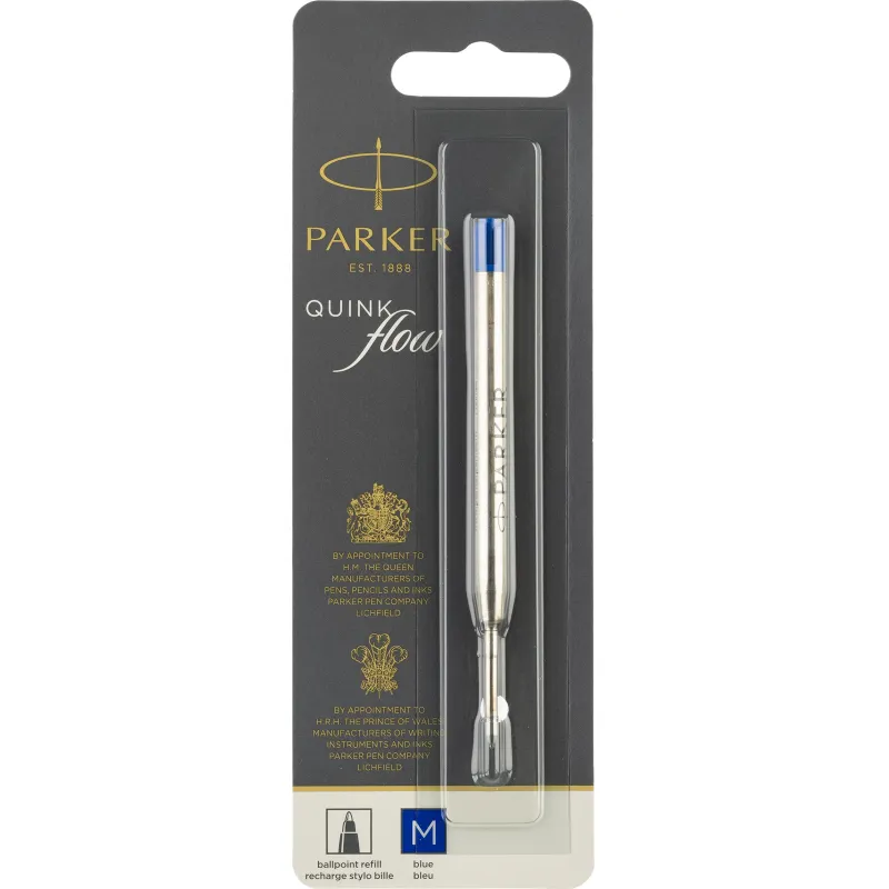 Стержень для шариковых ручек Parker с чернилами синего цвета, толщина линии - 0,8 мм, длина стержня - 98 мм, диаметр шарика - 1 мм. Обеспечивает мягкое письмо, чернила быстро высыхают, устойчивы к свету и влаге. Новое поколение стержней Quink c усовершенствованным пишущим узлом (шариком) и формулой чернил. Более гладкое письмо, быстросохнущая паста, точный контроль расходования чернил. Никелево-палладиевый пишущий узел (труба подачи и шарик). Подходит для всех шариковых ручек Parker. Внимание! Для самостоятельного подбора расходных материалов необходимо учитывать не только длину корпуса стержня, но и другие параметры: внутренний диаметр ручки, диаметр отверстия ручки и наконечника стержня, расстояние между пишущим узлом и 'ушками' (при наличии), поэтому рекомендуется проверять совместимость ручки и стержня вручную.