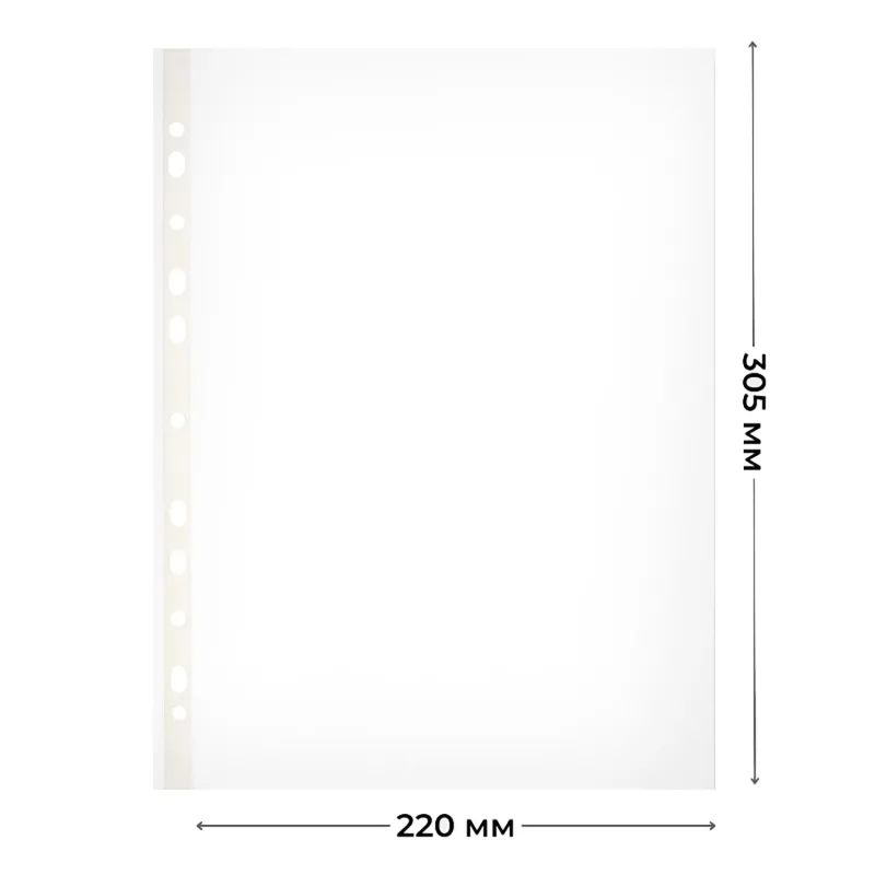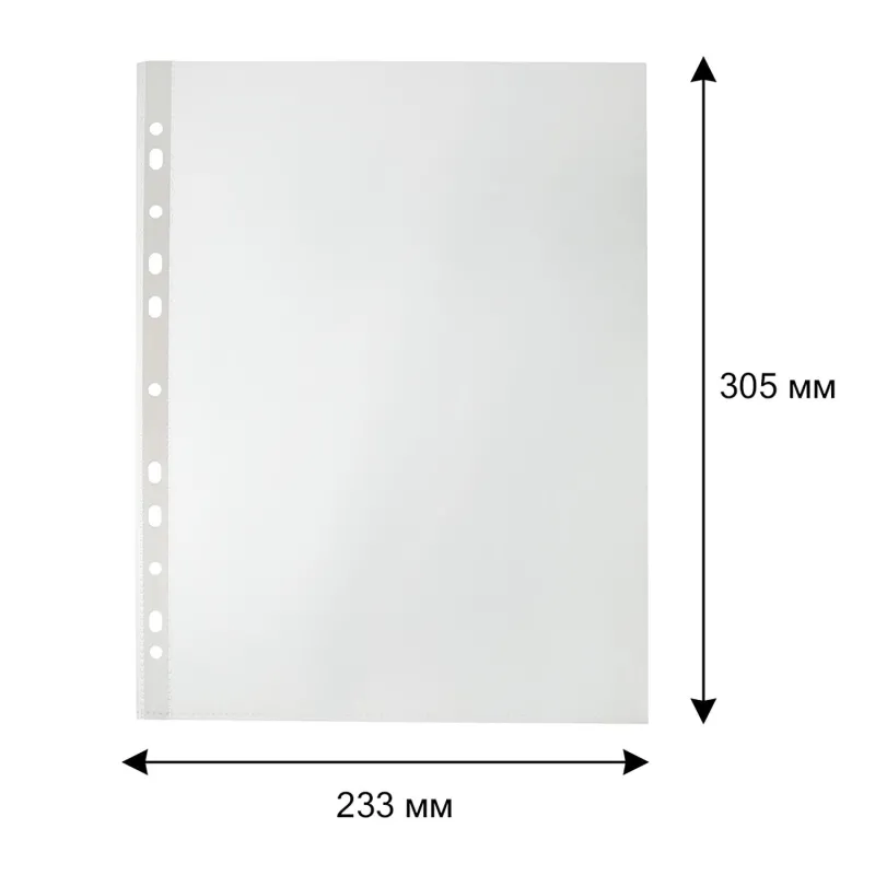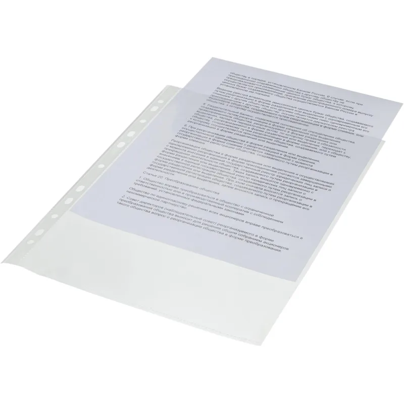 Файл-вкладыш Attache Economy формата А4, предназначенный для хранения и защиты печатных документов. Поверхность прозрачная, гладкая. Изготовлен из полипропиленовой пленки (толщина 50 мкм). Внешний размер: 233+/-2?305+/-2 мм, внутренний размер: 217+/-2?303+/-2 мм. Боковая перфорация подходит для разных типов скоросшивателей. В упаковке содержится 100 файлов. Каждый файл-вкладыш вмещает около 50 листов стандартной плотности.