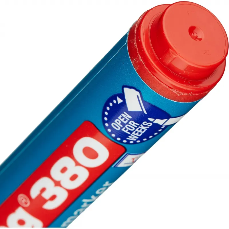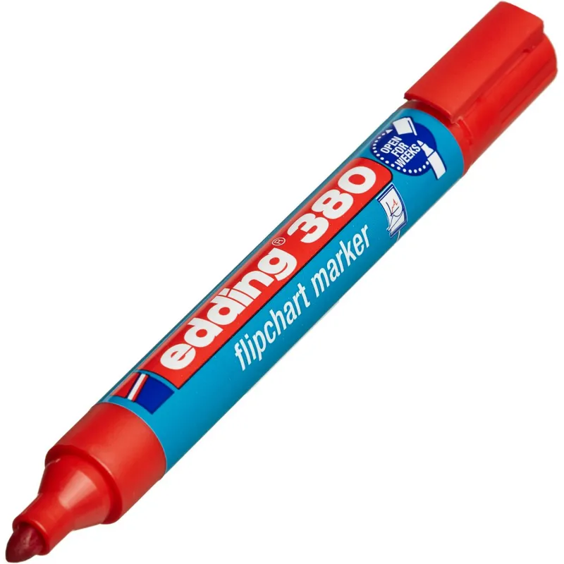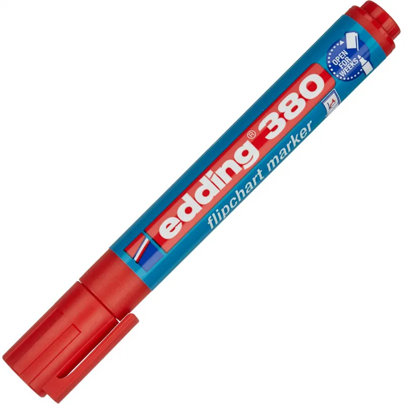 Маркер для бумажных флипчартов Edding E-380/2 с технологией cap off. Круглый наконечник. Пластиковый корпус. Толщина линии письма: 2.2 мм. Цвет: красный. Производство - Германия. Внимание! Маркеры предназначены только для бумажных поверхностей. Чернила на водной основе.