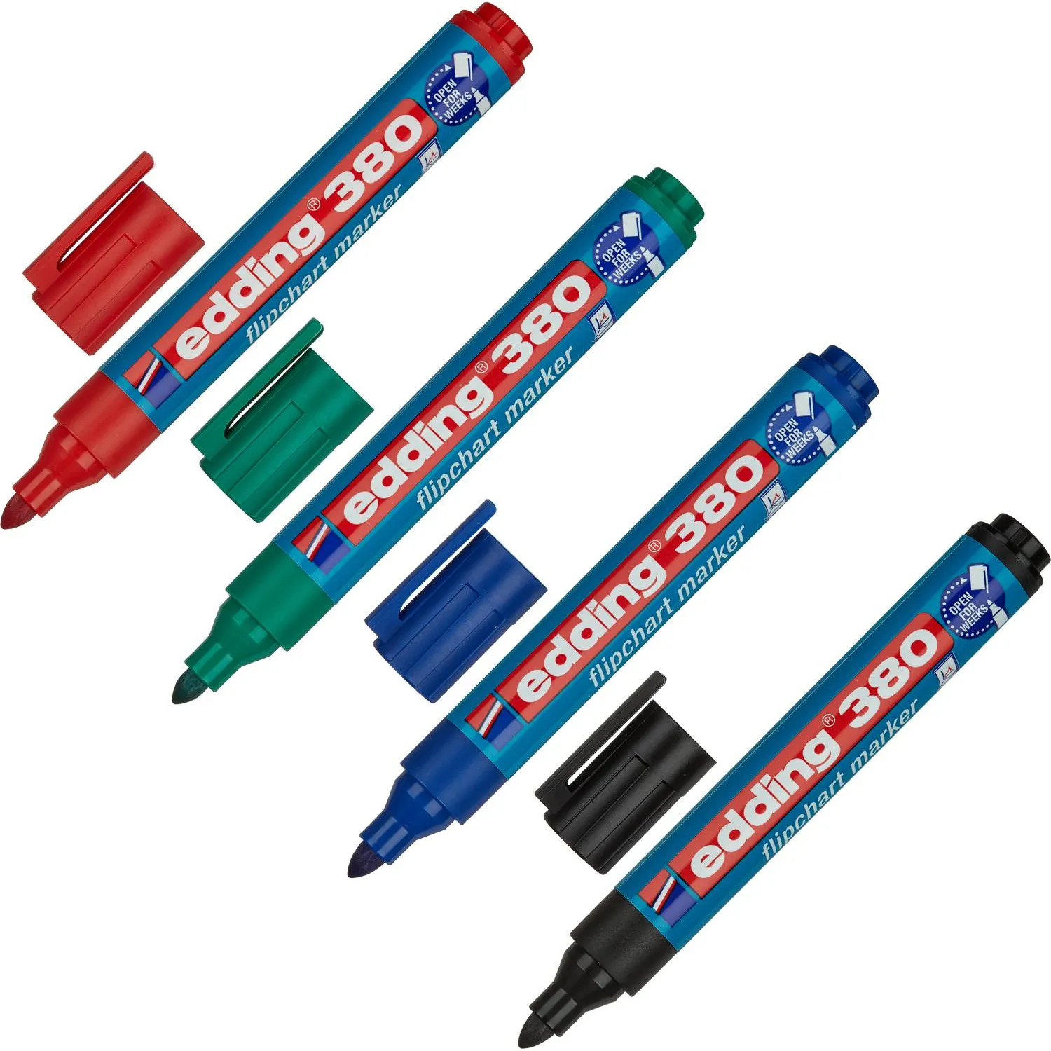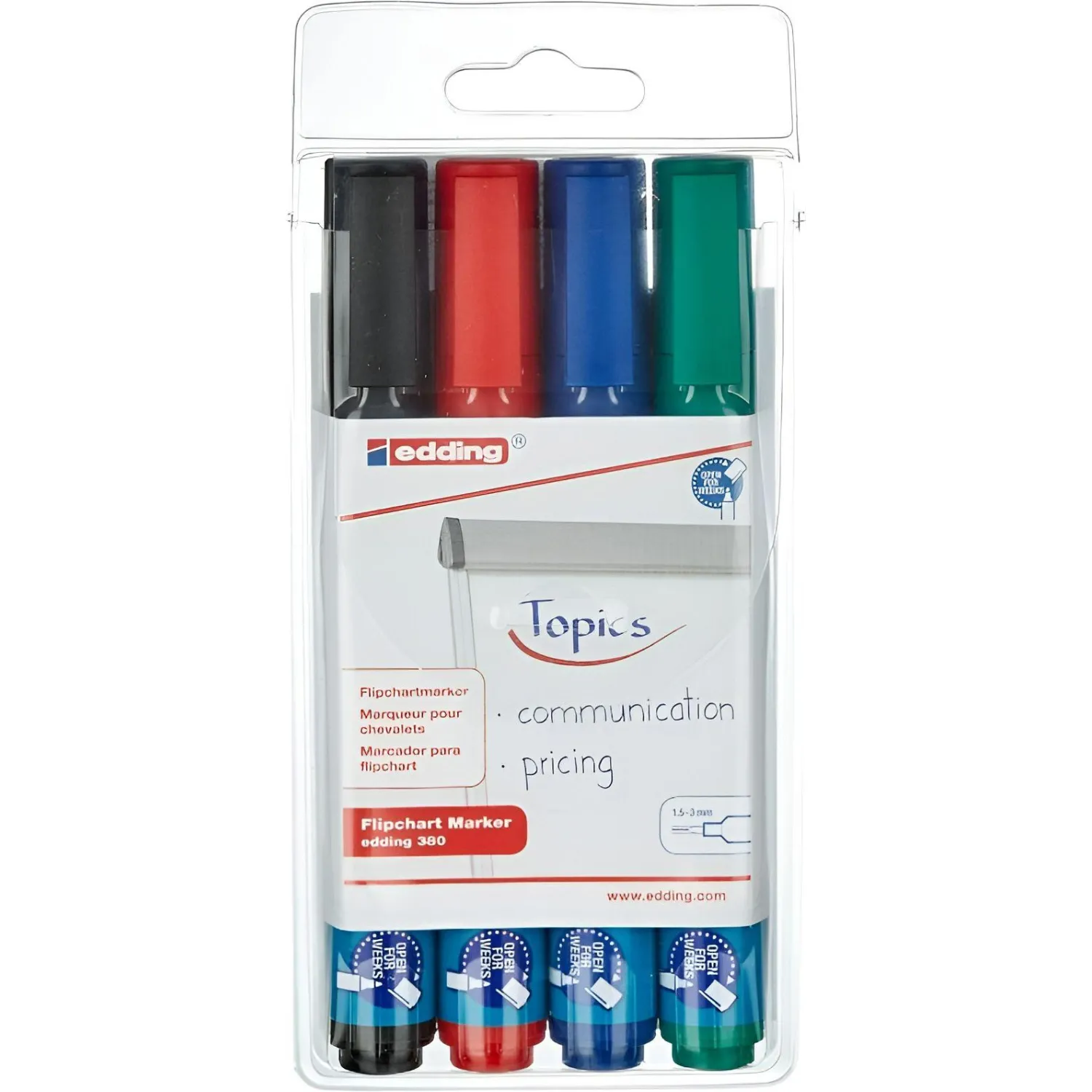 Набор маркеров Edding E-380/4S предназначен для использования на бумаге для флипчартов, с технологией &,#039,?cap off&,#039,&,#039,. Круглый наконечник. Пластиковый корпус. Толщина линии письма: 2.2мм. Цвет: черный. синий, красный, зеленый. Производство - Германия. Внимание! Маркеры предназначены только для бумажных поверхностей. Чернила на водной основе.