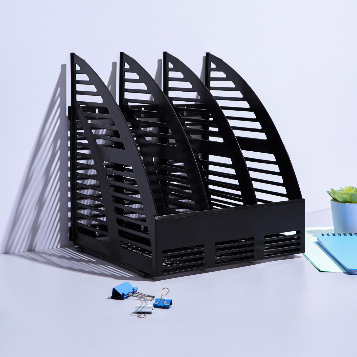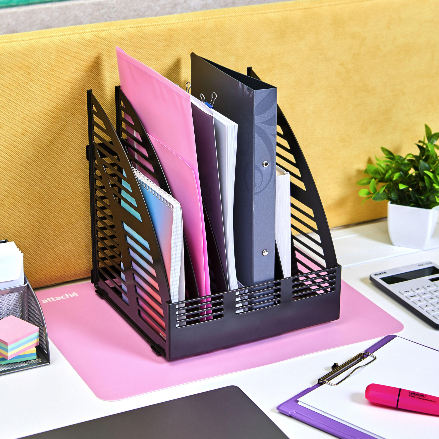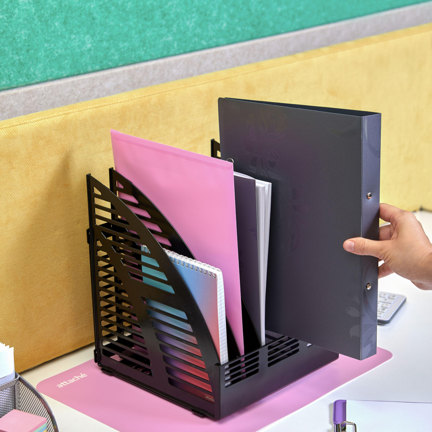 Вертикальный накопитель Attache выполнен из пластика черного цвета. Минималистичный дизайн лотка создаст на Вашем рабочем месте ощущение легкости. Не занимает много места на рабочем столе. Позволяет удобно хранить документы и печатную продукцию формата А4. Имеет 4 отделения. Размеры изделия (ДxШxВ): 235x240x285 мм. Вес: 590 г. Конструкция требует самостоятельной сборки, что позволяет регулировать ширину отделения кратно 40 мм. Съемный передний бортик. Возможно крепление на вертикальных плоскостях. Удобен для хранения большого объема документов. Этикетки для маркировки в комплект поставки не входят.