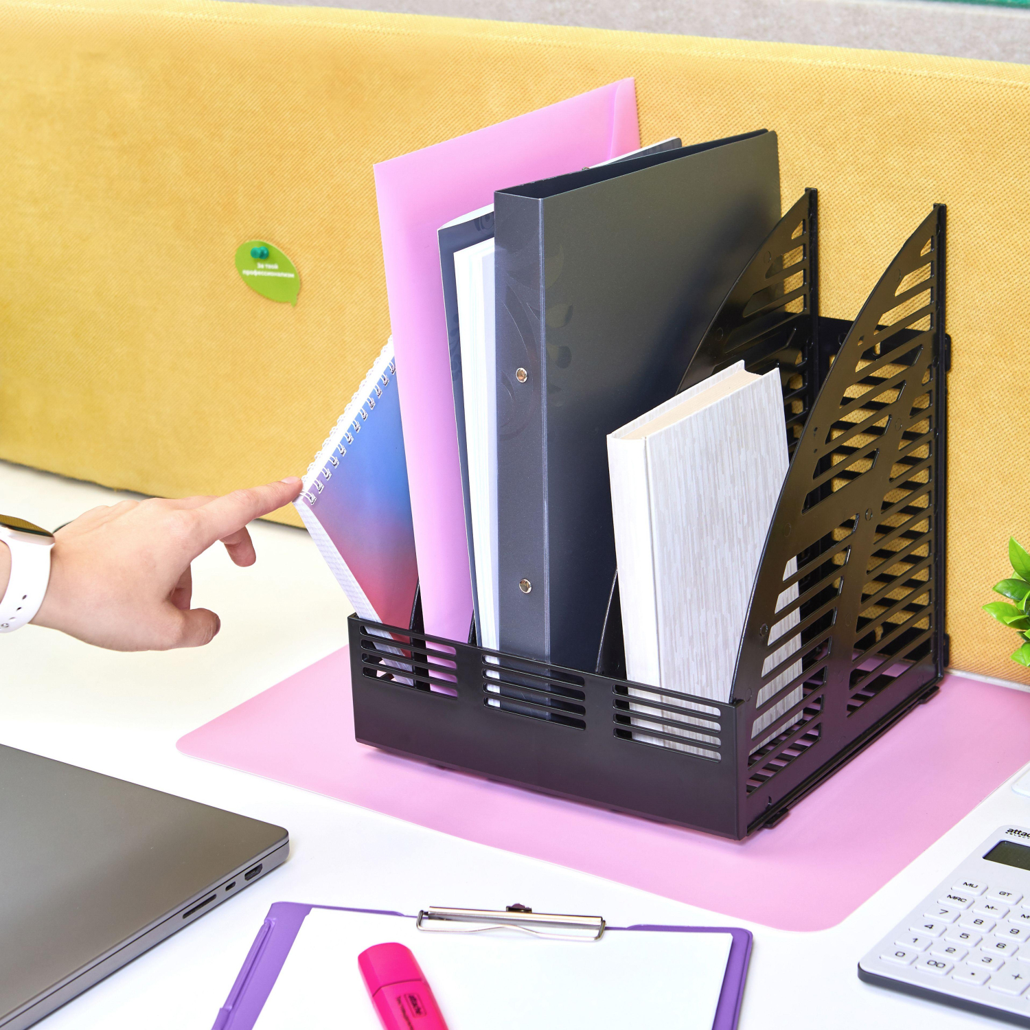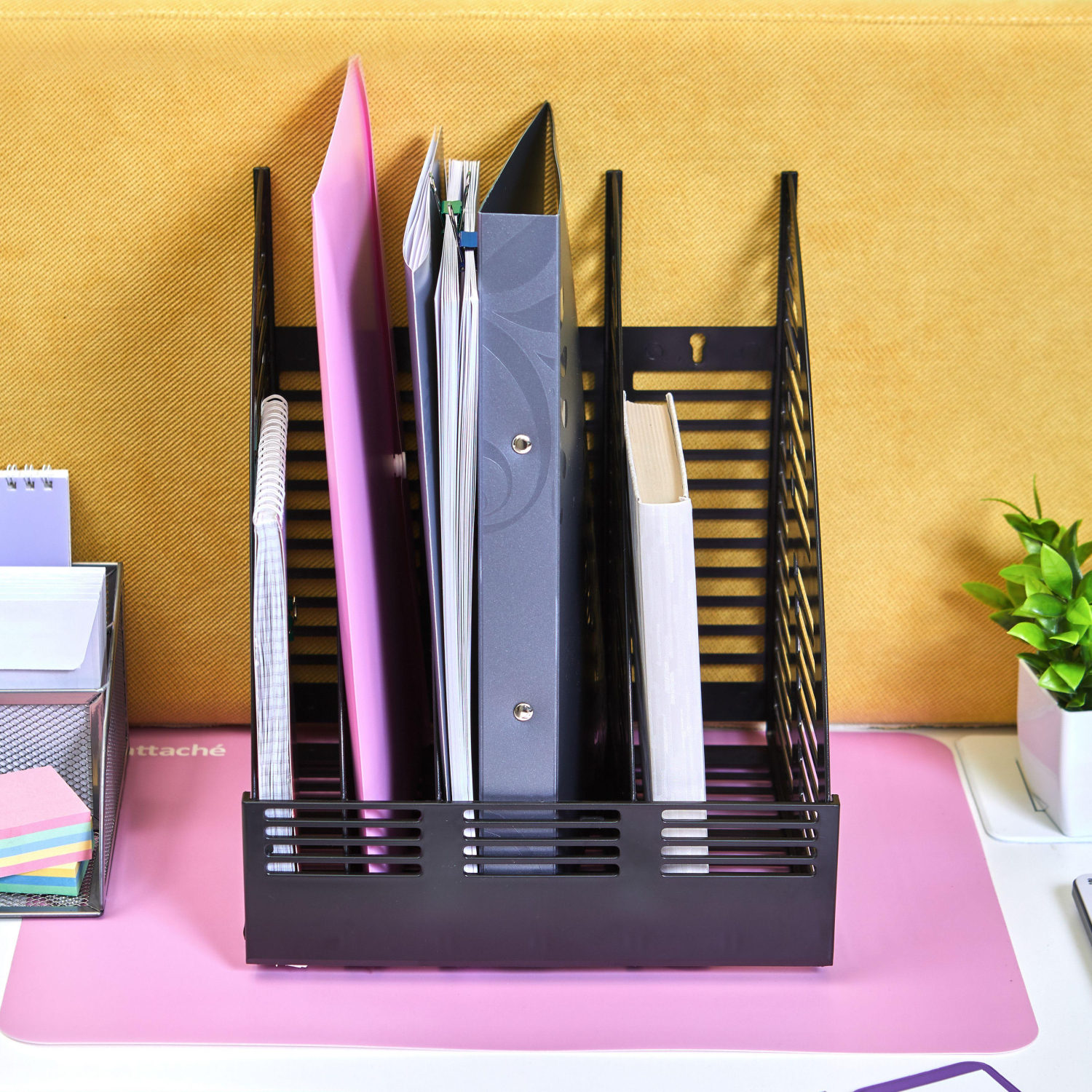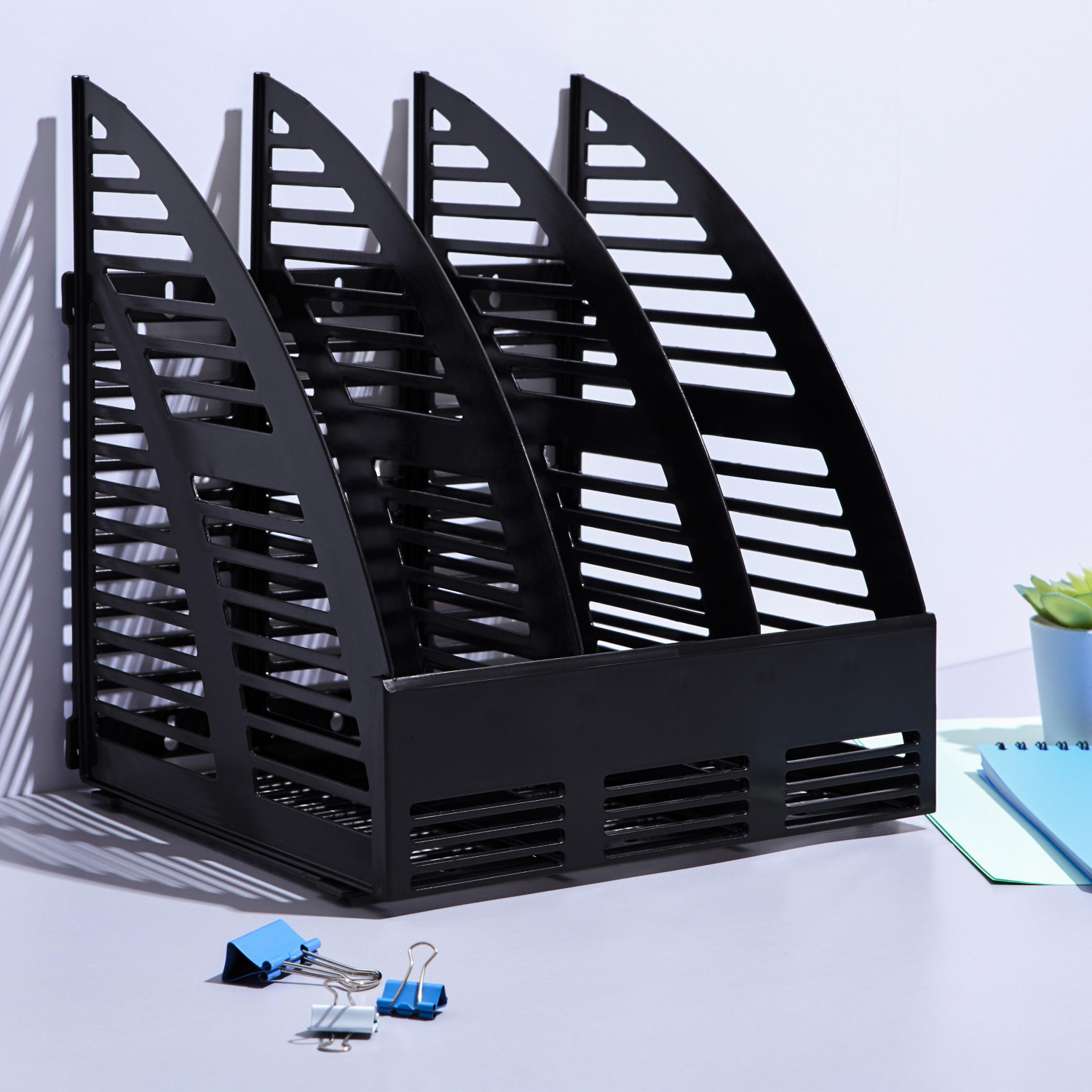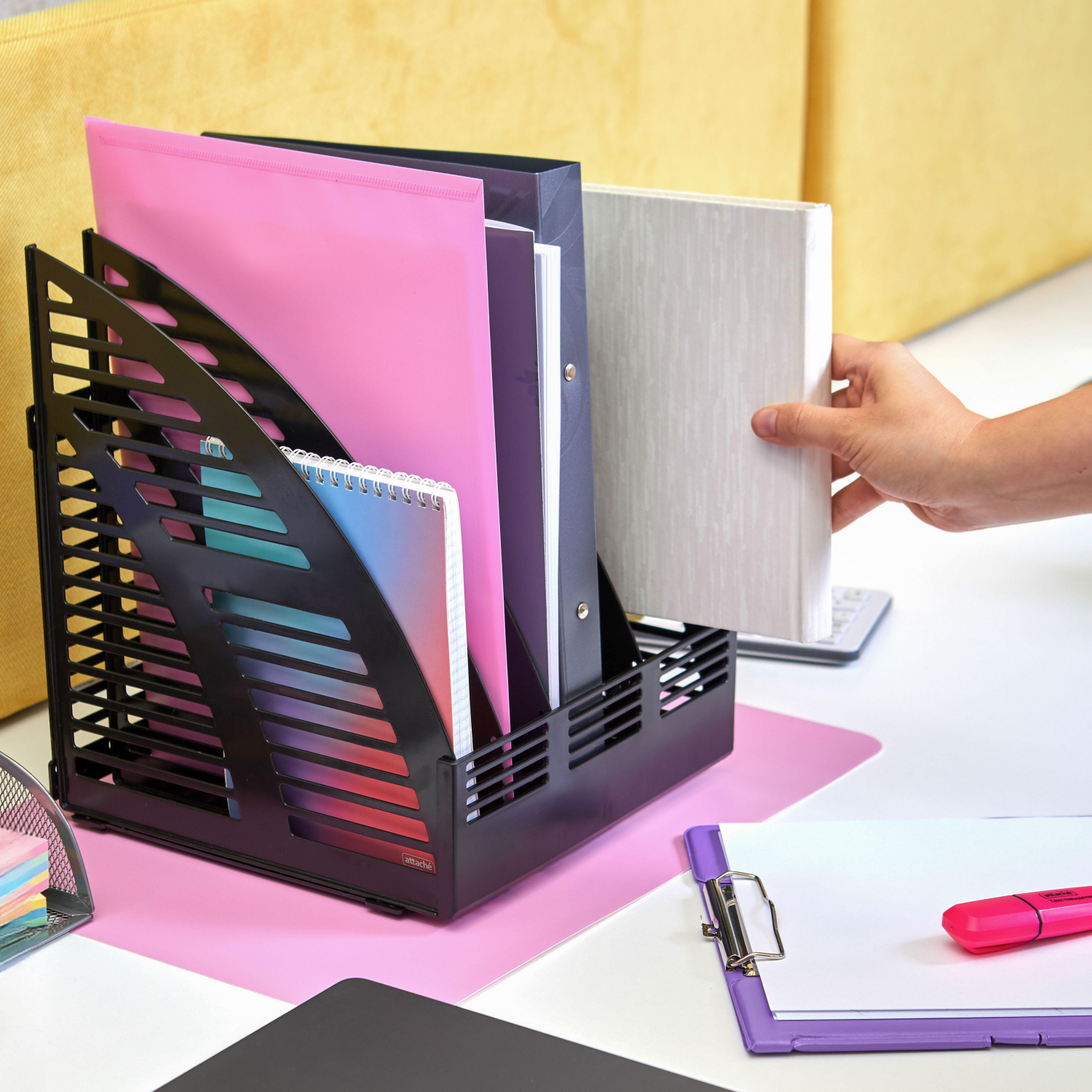 Вертикальный накопитель Attache выполнен из пластика черного цвета. Минималистичный дизайн лотка создаст на Вашем рабочем месте ощущение легкости. Не занимает много места на рабочем столе. Позволяет удобно хранить документы и печатную продукцию формата А4. Имеет 4 отделения. Размеры изделия (ДxШxВ): 235x240x285 мм. Вес: 590 г. Конструкция требует самостоятельной сборки, что позволяет регулировать ширину отделения кратно 40 мм. Съемный передний бортик. Возможно крепление на вертикальных плоскостях. Удобен для хранения большого объема документов. Этикетки для маркировки в комплект поставки не входят.