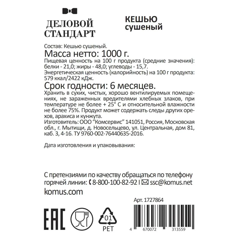 Кешью сушеный "Деловой Стандарт" очень вкусный и полезный продукт. Ядра кешью калиброванные, кремового цвета без пятен, обладают приятным ореховым вкусом со сливочными нотками. Кешью широко применяется в кулинарии, особенно его любят добавлять в блюда азиатской кухни. Эти орешки очень популярны среди приверженцев здорового питания, а также веганства и вегетарианства. Ядра кешью подходят для производства масла, употребляемого в пищу в качестве заправки к салатам или добавки к супам и гарнирам. - Состав: кешью сушеный, ядро. - Пищевая ценность: белки - 21 г, жиры - 48 г, углеводы - 15,7 г. - Энергетическая ценность: 579 ккал/2422 кДж. - Срок годности: 180 дней. - Условия хранения: от +5 до +25°С и относительной влажности не более 75%. - Вес: 1000 г.- Страна производства: Россия.