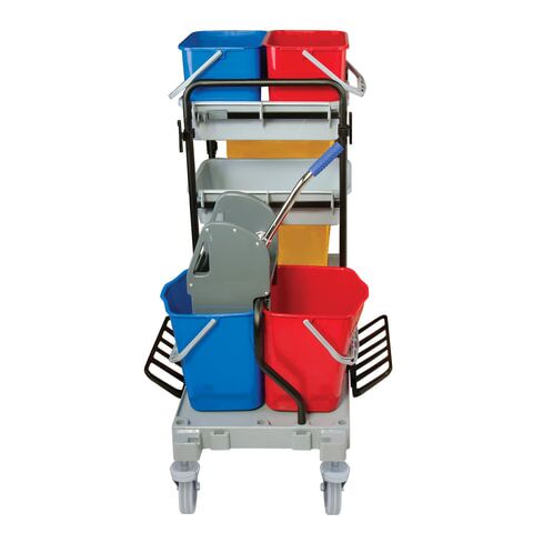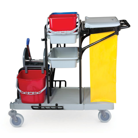 Представляет собой металлический каркас с установленными на него механическим отжимом для петельных тряпок и МОПов и 4 съемными ведрами по 20 и 11 л. База изготовлена из качественного пластика и металла, а инвентарь - из пластика. Тележка выполнена в следующих цветах: желтый, красный, серый, синий. Колеса позволяют перемещаться в произвольном направлении.