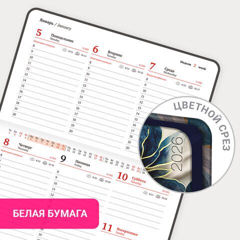 Датированный еженедельник BRAUBERG "Vista" выполнен в оригинальном дизайне. Твердая обложка из материала "под кожу" украшена дизайнерским принтом, приятным на ощупь. Внутренний блок включает 64 листа белой бумаги плотностью 70 г/м2. Благодаря малому форма