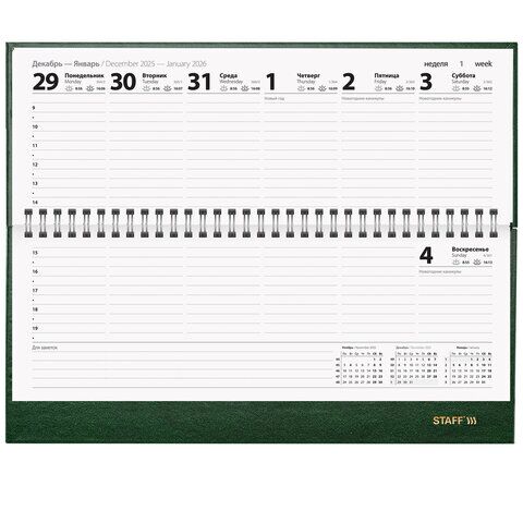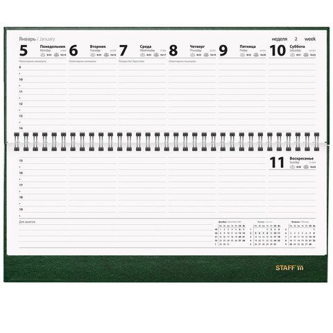 В датированном планинге STAFF все дни недели расположены на одном развороте, благодаря чему очень удобно планировать важные дела на неделю вперед. Внутренний блок содержит 64 листа офсетной бумаги белого цвета плотностью 65 г/м2. Обложка из бумвинила и тв