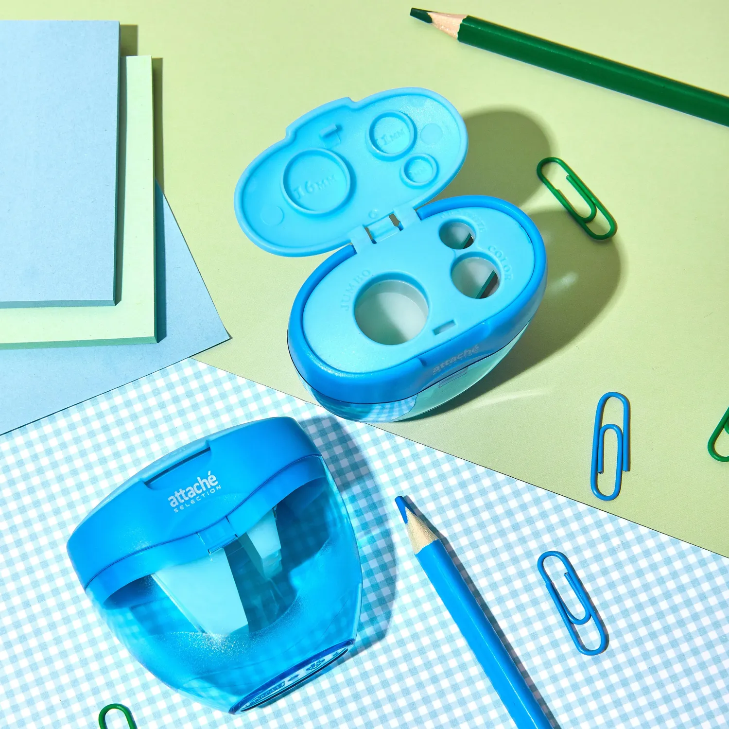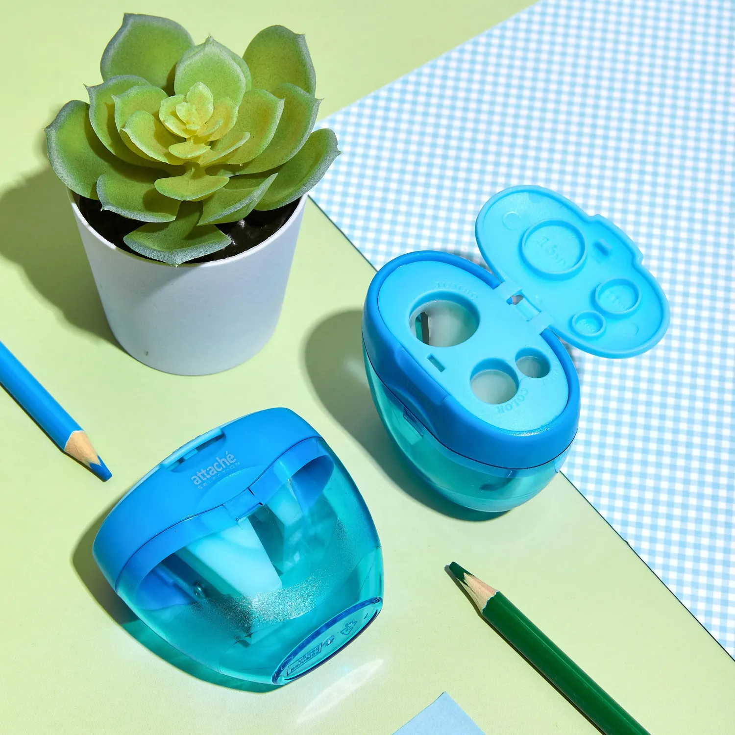 Точилка незаменимый помощник, если вы используете в работе чернографитные и цветные карандаши, которые обязательно требуют заточки. Точилка Attache Selection в пластиковом корпусе с тремя отверстиями для заточки (8 и 11, 16 мм) и контейнером для стружки. Эргономичный корпус овальной формы выполнен из пластика. Острые стальные лезвия обеспечивают быструю и легкую заточку. Карандаш затачивается аккуратно, а опилки остаются в специальном контейнере. Предназначена для заточки карандашей диаметром 8 , 11 и 16 мм. Цвет - голубой. Поставляется в блистере с европодвесом. Размер: 63х35х60 мм.