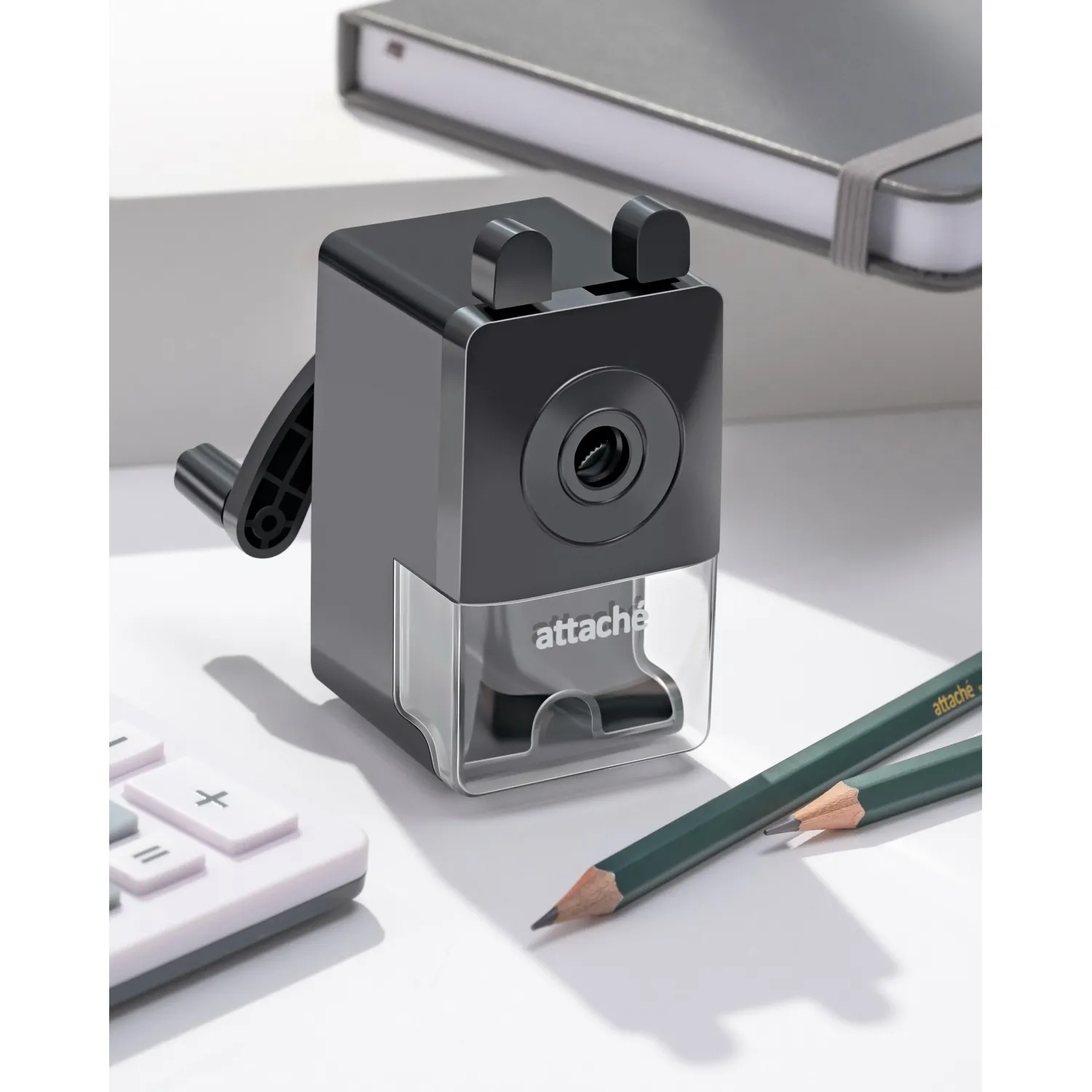 Механическая точилка для карандашей Attache Economy выполнена в корпусе из пластика черного цвета. Легкая и безопасная в использовании точилка оснащена металлическим сердечником и удобной ручкой, что позволит максимально быстро заточить большое количество карандашей. Предназначена для круглых, трехгранных или шестигранных карандашей диаметром до 8 мм. Ограничений по длине карандаша нет. Точилка имеет вместительный контейнер для сбора стружки. Размер точилки: 90x90x45 мм. Инструкция по использованию: 1. Оттяните до упора прижимной механизм, располагающийся над контейнером для стружки. 2. Нажмите на маленькие рычаги в верхней части точилки для раскрытия креплений(зубов) в отверстии. 3. Поместите карандаш в отверстие до упора. 4. Отпустите рычаги для фиксации карандаша. 5. Придерживая точилку сверху, проворачивайте ручку до тех пор, пока она не будет проворачиваться вхолостую. 6. Нажмите на язычки и, удерживая, выньте карандаш из точилки. 7. По заполнении контейнера для стружки требуется его очистка во избежание поломок и блокировки точилки. Рекомендована для использования дома и в офисе. Товар относится к ценовому сегменту ",суперэконом",. Имеет упрощенные характеристики и более простую упаковку. Отвечает основным требованиям потребления.?