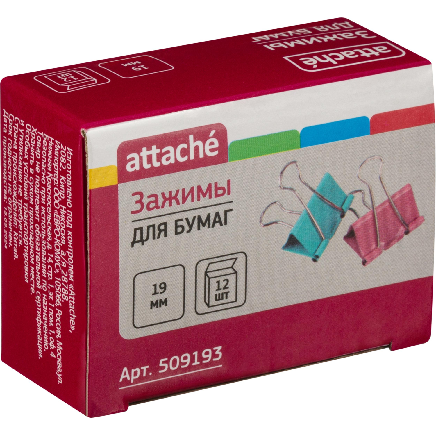 Металлические зажимы для бумаг Attache используются для скрепления документов без использования степлеров. Зажимы с цветным покрытием. Цвета зажимов в упаковке: желтый, синий, голубой, розовый. Размер зажима: ширина 19 мм, высота 32 мм, глубина закладки 10 мм. Позволяет скреплять до 80 листов плотностью 80 г/кв.м, не деформируя при этом бумагу. Зажимы для бумаг поставляются по 12 штук в картонной упаковке. В транспортном коробе 50 упаковок.