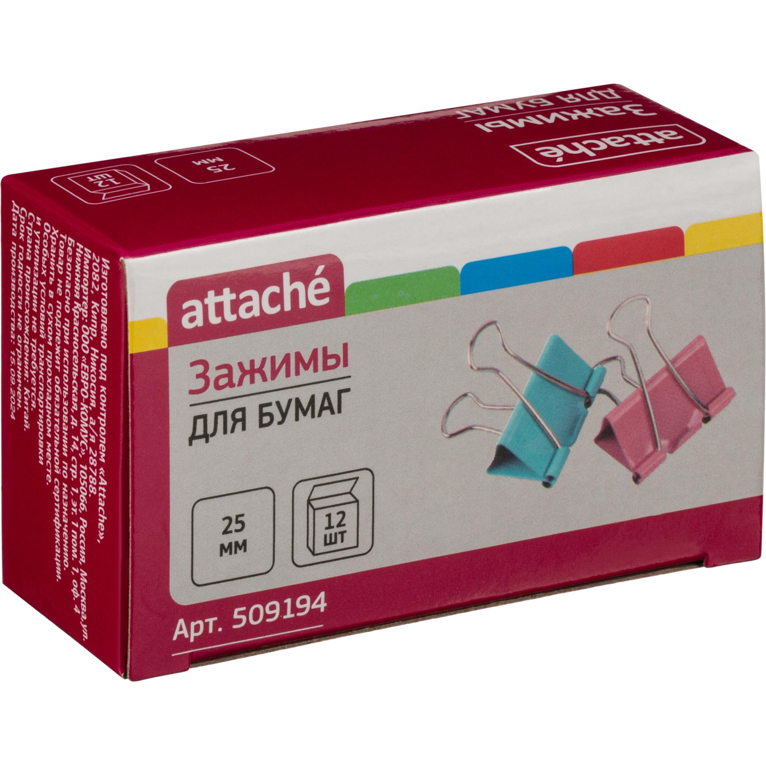 Металлические зажимы для бумаг Attache используются для скрепления документов без использования степлеров. Зажимы с цветным покрытием. Цвета зажимов в упаковке: желтый, синий, голубой, розовый. Размер зажима: ширина 25 мм, высота 36 мм, глубина закладки 18 мм. Позволяет скреплять до 100 листов плотностью 80 г/кв.м, не деформируя при этом бумагу. Зажимы для бумаг поставляются по 12 штук в картонной упаковке. В транспортном коробе 40 упаковок.