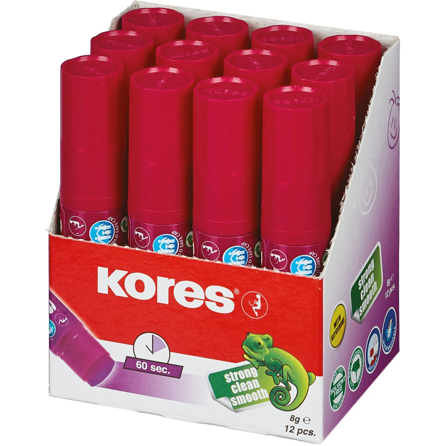 Клей-карандаш Kores Chameleon предназначен для склеивания картона, бумаги, текстиля. Имеет большой срок хранения. Вес - 8 г. Клей оставляет цветной след, который позволяет точно определить место нанесения и затем обесцвечивается. Легко смывается водой и отстирывается, не имеет запаха. Быстро сохнет, расходуется экономично. Морозостоек. Клей содержит глицерин. Характерной особенностью является возможное выделение глицериновых капель на поверхности данного клея, что придает легкость скольжения и возможность легкого нанесения клея на бумагу, тем самым обеспечивая экономичное расходование клея.